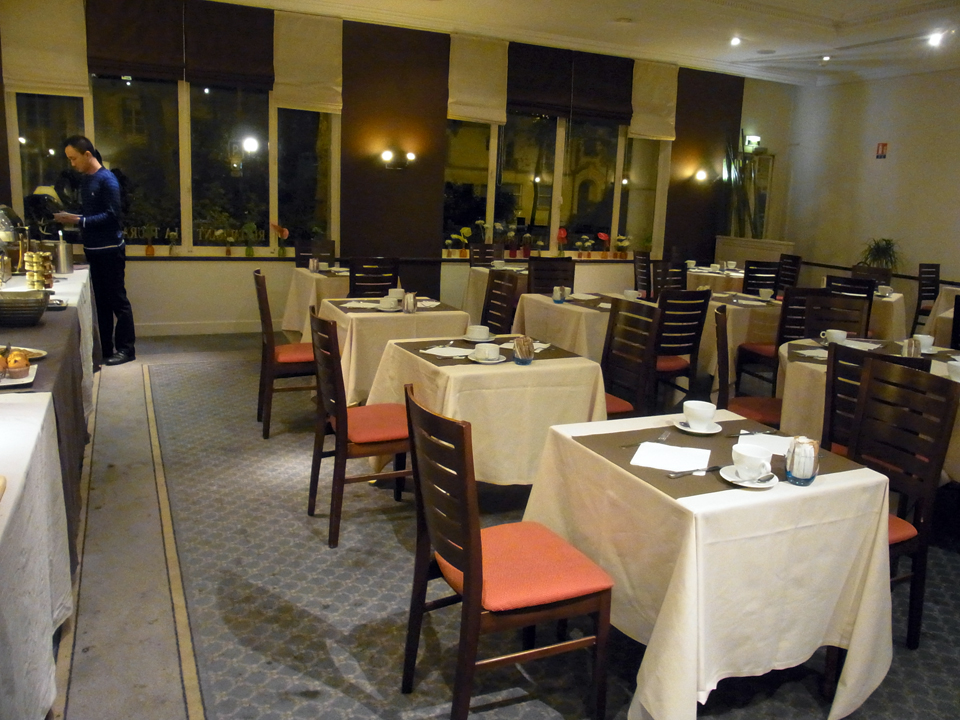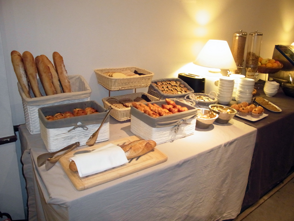 2日目の朝はホテルで朝食ビュッフェ。フランスはパン、チーズ、ヨーグルトなどが美味しいので、それが楽しみ。朝早かったので一番乗り★クロワッサンにシェーヴルも美味しい〜!エスプレッソマシンで作ったコーヒーにホットミルクをたっぷり入れて、ほとんど珈琲牛乳(笑)ジャムもすごくたくさん種類がある。でも朝からそんなに食べれない。 |