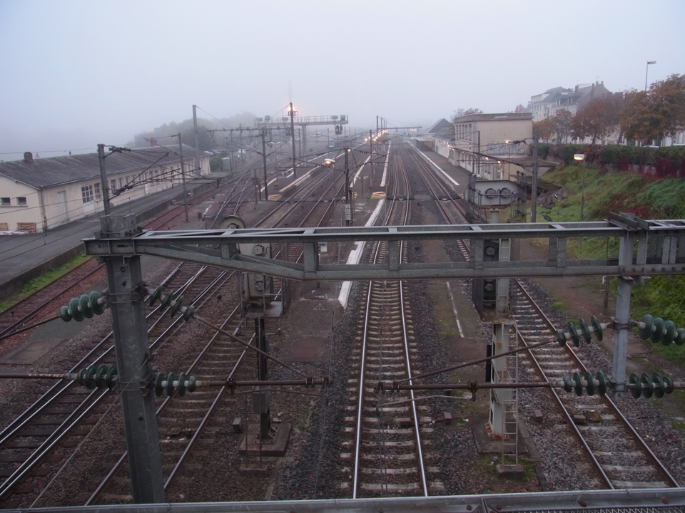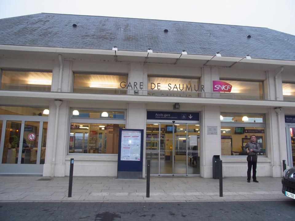 | ここで問題発生!まず予定していた7時45分発のソミュール行きがない。駅のインフォメーションがオープンしてるので、そちらで聞いてみた。すると、サン・ピエール・デコールまで(1駅)ナベットで行き、サン・ピエール・デコールからソミュールに行く列車しかないようで、その切符を買うために券売機に戻るが、なんかあり得ない値段のものしか出てこない。回数券か、何日か使える券になっているのかも。。。ナベットの買い方もわからない。そうこうする間にどんどん時間は迫ってきて、もう一度インフォメーションに行って、ナベットの券の買い方がわからないというと、その人が時間を見て、あと1分で出発すると気づき「もう行け!行け!中で買え!」的なことを言ったのでそのまま乗り込む。そしてサン・ピエール・デ・コールで、ちょうど窓口が開く時間だったので8時まで待ち、窓口は2つしか開いてない。私たちは3番目。前の2人がやたら遅く、なんとか出発ぎりぎり1分前に切符を受け取り、ホームまでダッシュ!セーフ!ふぅ〜これを逃すとソミュールに行く電車は1時間半後しかないので、今日の午前の予定は全滅するところだった。電車については旅のミニ情報のページを参照。 |