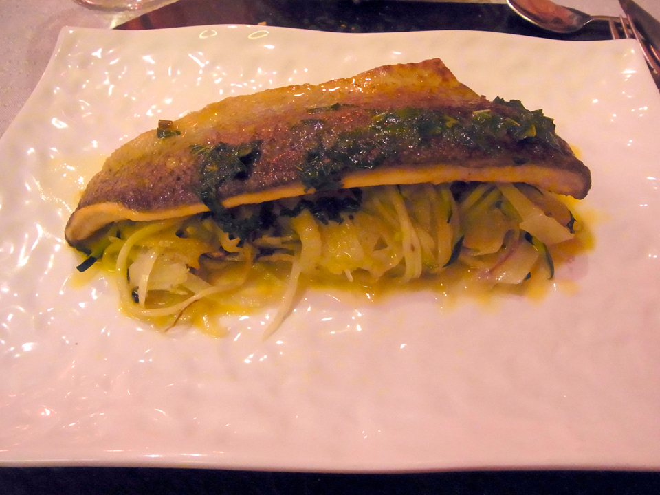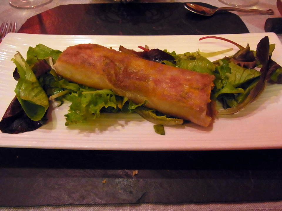 | 行きはアナトール・フランス駅までトラムに乗り、コルベール通りを歩き、帰りはホテルまでテクテク歩いて帰った。トラムについてはまたトゥール最終日にも書くけど、旅のミニ情報・トラムのページも。コルベール通りというのは両サイドにレストランが建ち並ぶところで、とても賑わっている。そしてこのお店(レドニスト)はコルベール通りの終点を右に曲がったところにある。人気のお店という触れ込み通り、ビストロなのに結構美味しかった!グラスワインを聞いてみたら、なんとモトックスで何度か買ったことのあるヴーヴレが出てきてびっくり!お店の人に「これ飲んだことあるよー」と言ったら、むこうも少しびっくりしてた(笑)ヴーヴレはだーりんが飲むことにし、私はまだ飲んだことのないシノンの白と、シノンの赤を注文。前菜の春巻きみたいなのはフォアグラも入ってて美味しかった!でも魚はいまいち。。。白ワインだからといって魚にしなくてもいいかも。 |