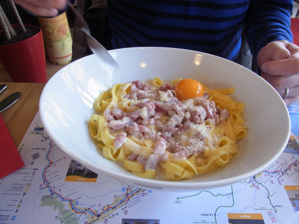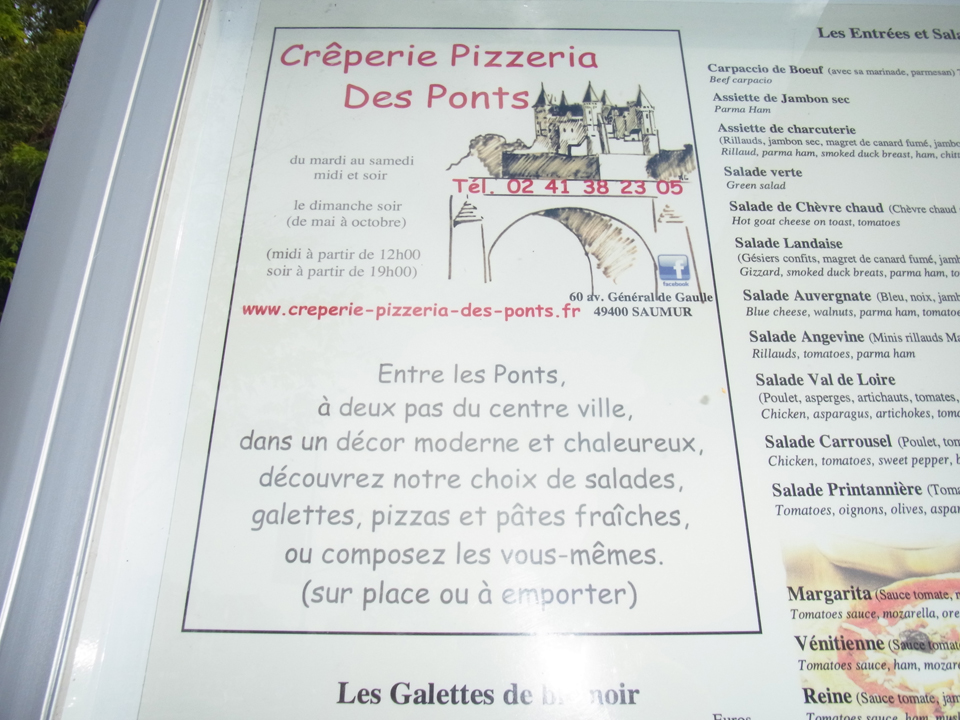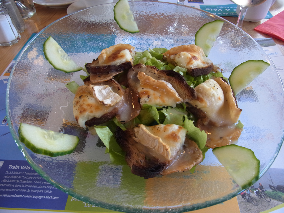 | シェーヴルサラダはトマトを入れないようにちゃんと注文出来た(笑)ワインのエチケットの写真を撮りたかったけど、次から次へとお客さんが来るし、メニューを見る限りワインにはあまり力を入れてなさそうなので、諦めた(笑)ランチョンマットが自転車ルートの地図だったので、結構自転車で回る人もいるのかもと思って色々調べていたら、La loire a veloというサイトがあり、どうやらロワール渓谷の800kmを自転車で走れるように自転車専用道路が造られていて、その道路の名前のようです。velo(自転車)用の道路とわかるような標識もあったのも納得。それとこの店の並びに店先に果物を置いてる食料品店があって、そこでオランジーナ買ったら1.5€だった。パリと比べるとだいぶ安い。いい雰囲気を醸し出してたのに、そのお店の写真撮り忘れた! |