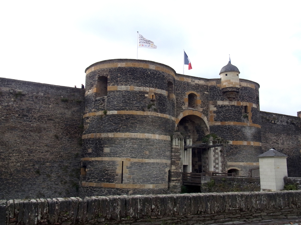 そしてここがアンジェ城の入り口。実はチケット売場の前まで行ったけど、アンジェの観光の中でもお城の内部見学は優先順位が低かったので、全部見終わって時間が余ったらもう一度来ることにした。けど、結局時間が足らず、入らなかった。ヨハネの黙示録のタピストリーはちょっと見たかったな。一番右の銅像はたぶんアンジュー公。 |