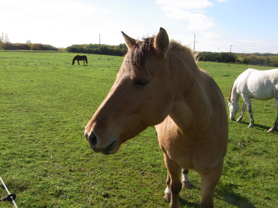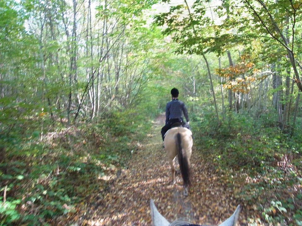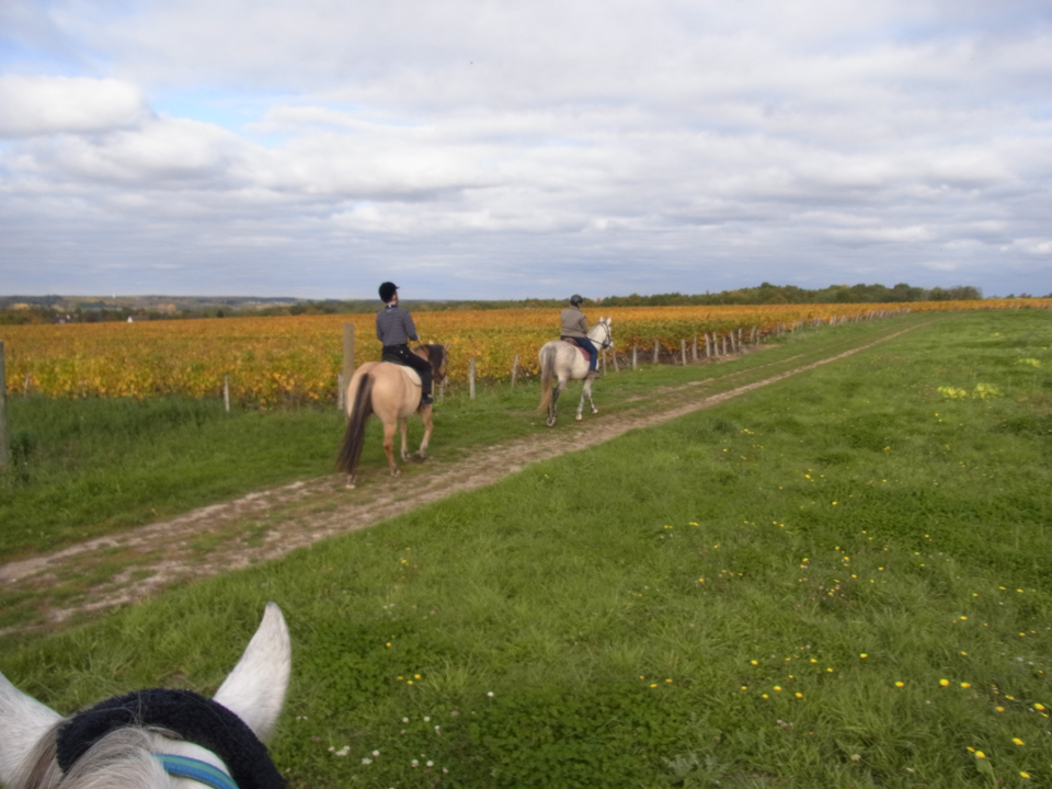 | 最初にその先導係の人にどれくらい経験があるか聞かれたので、4級ライセンスは日本だけだし、一応24鞍乗ったことほ伝えた。私の後ろには後従の馬もいて、4頭で森の中を歩いたり、葡萄畑の間を速歩したりと、最初はすごく楽しかった。乗馬クラブのように前がつかえたり、ストップがかかることもなく、長い間速歩ができる(*^^*)お天気もいいし、空気もきれいし、景色はいいし最高!ただ、私の馬(アレシア)は、最初からちょっと遅れ気味だったけど、だんだんいうことを聞かなくなり、どんどん遅れるし、顔を上下に大きく振ったりして、とても乗りにくくなってきた。先導の人が駆歩してくれた時も、走ってる時に頭を振るのでバランスが崩れ、鐙をはずしてしまい、落ちそうになって駆歩はすぐに終わってしまった。でもまあそれはそれとして、初めての外乗がフランスの田舎ってのは、とてもいい経験になって楽しかった(*^^*) |