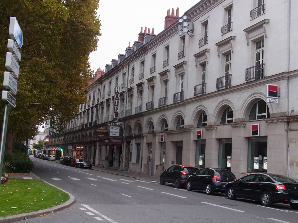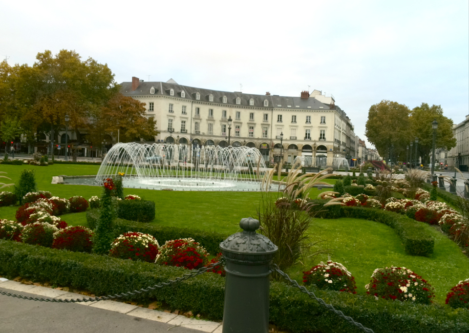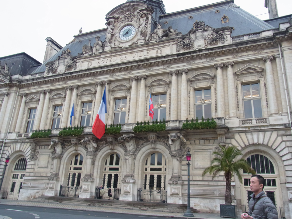 今日は10時46分の電車でアンボワーズへ行ってしまうので、1時間半くらいしか観光ができない。トゥールの町をゆっくり見れるのもこの時だけ。噴水のあるところはジャン・ジョレス広場。この立派な建物は市役所で、向かいがギャルリー・ラファイエット。トラムが走っているのがナシオナル通り。左はホテルの裏手でプランタンの正面玄関かな。 |