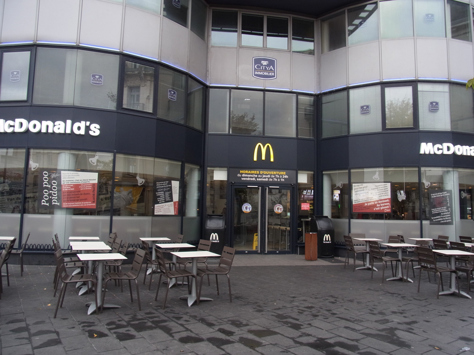 | 日曜日の早朝のせいもあり、カフェがやっていない!!ということで、一度は行ってみるマクドナルド(笑)セットしかなくて、チーズバーガーセットにした。ポテトは日本でもお馴染みの細いフレンチフライとボテッとした大きめのポテトの2種類がある。さすがじゃがいもの国!あと、やっぱりチーズバーガーのチーズが美味しい!ただ、チーズバーガーセットが7.5€。今ユーロが高いせいもあるけど1050円って!テーブルも店内も、ゴミ箱のイラストもマクドにしてはおしゃれ(笑)この人トゥールの有名人かな・・・調べたけどわからなかった。 |