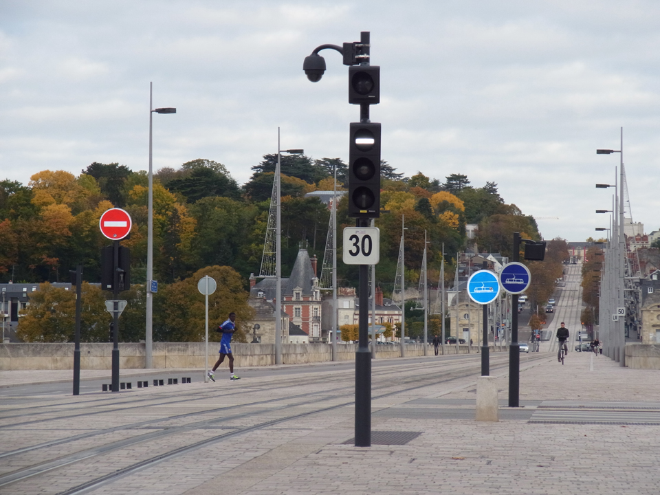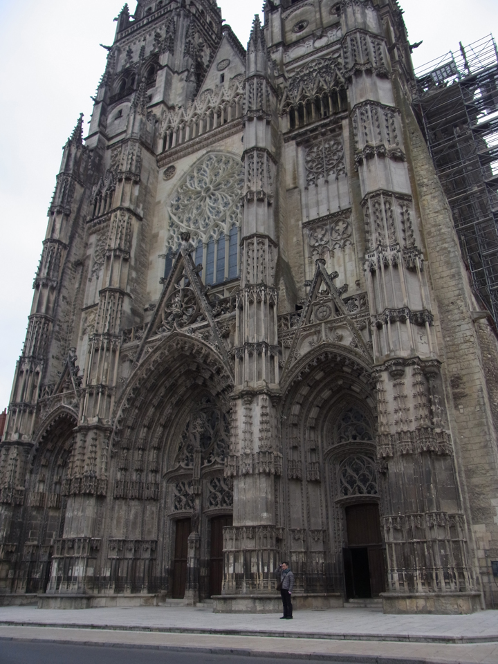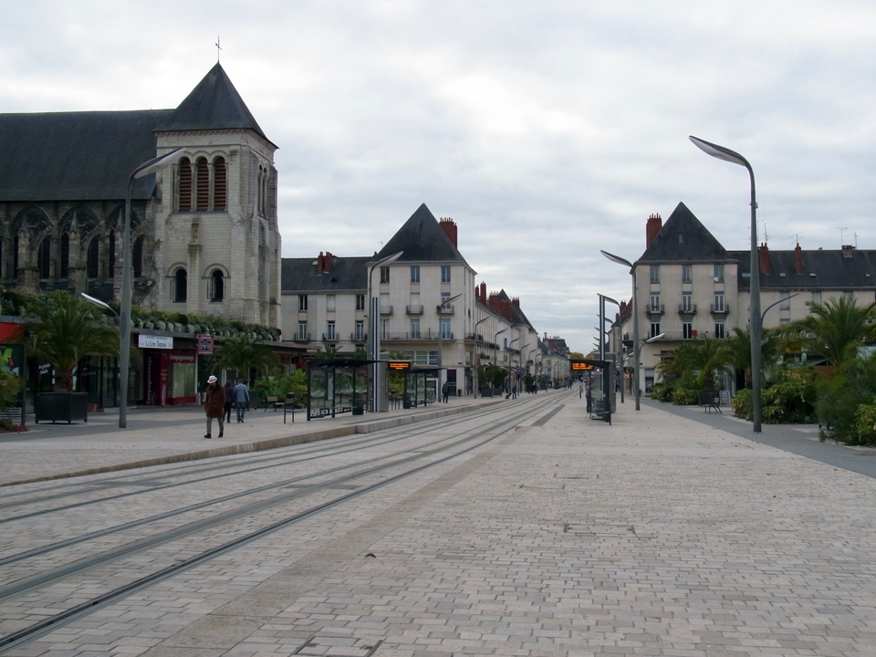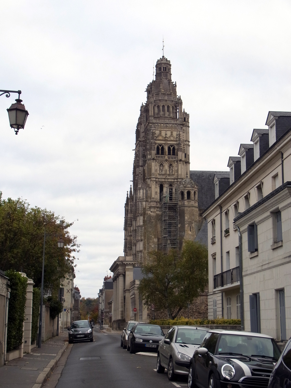 | トゥールの駅の右側にもトラムの駅「GARE DE TOURS」があるので、そこからトラムに乗ってまずはトゥール美術館へ。ところが、切符を買っている間にトラムが来て発車してしまい、次の電車が10分以上後なので、その切符は帰りに使うことにして歩くことにした。ウルトゥルー通りからジュール・シモン通りに入り、遠くにサン・ガシアン大聖堂が見えてきた!トラムについては旅のミニ情報・トラムのページへ |