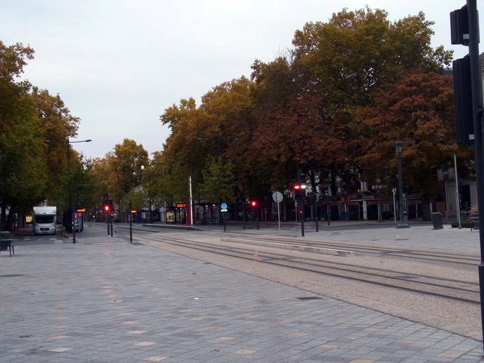 | それならと、次に行きたかったすぐ横にある職人の博物館へ行ってみたら、こちらは10月19日から数週間、改装のために休館するという貼り紙が貼ってあった。1週間早く来ていたらなあ。ということで、トラムの「アナトール・フランス駅」周辺の景色をお楽しみください。 |