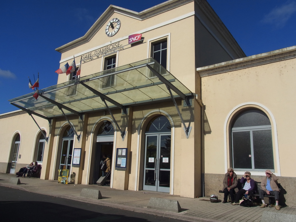 右がアンボワズ駅。日本で駅周辺ののことを色々調べたら、タクシーはいないみたいで、ホテルは駅の南側だし、電車を降りると駅の北側に出てしまう。なので、ホテルに予め「11時10分に電車が着くのでタクシーを呼んでおいて欲しい。私はピンクのスーツケースで主人は黒の大きなスーツケースでグレーの服着てます」というメールをしておいたら、ボルディエタクシーを手配してあるよーという返信があった。駅の前に、大きく「bordier」という文字と電話番号の書いたバンが止まっていた。陽気なおじさんで、確かにピンクと黒のスーツケースだねー(笑)みたいなことをいいながら荷物を積んでくれた。 |