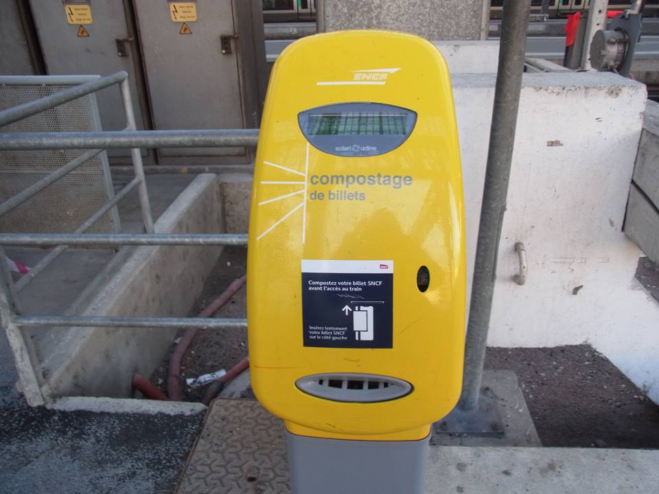 駅について案内板を見ると、なんとリヨンパールデュー行き。一昨年リヨンに行ったので懐かしい〜!左は刻印機。切符は必ずここで刻印(composter)しなければならない。切符を買う時にいつも言われる。機械で買うのはなかなか難しいので、やっぱり有人の窓口でチケットを買うのが安心。Billetterieは8時からしか開いていないので注意! |