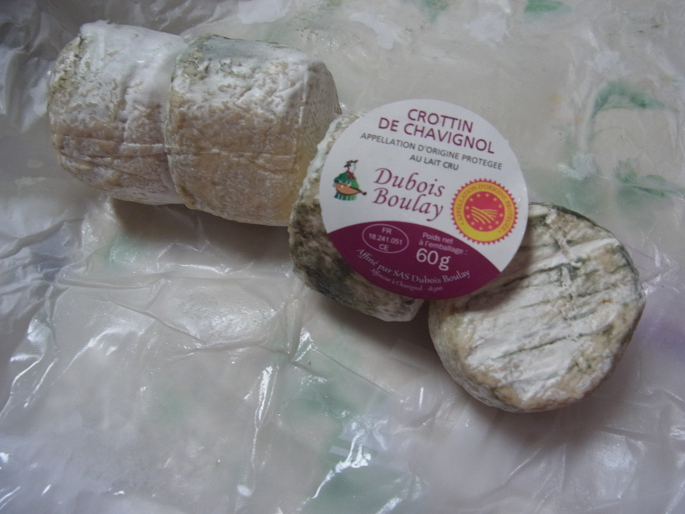 | その後はさっき閉まっていたチーズやさんへ。サンセールへ来たもう1つの目的はクロタン・ド・シャヴィニヨル。それもアンリ・ブルジョワがたまたまシャヴィニヨル村にあったので、本場のシャヴィニヨル村で買えるとは!!クロタンとは馬糞のことで、まさに「シャヴィニヨル村の馬糞」という名前の山羊のチーズ。銀座三越で値段チェックしたら、一回り大きい気もするけど、1個2000円くらいしてたし、チーズ王国でも1000円してた。このデュボワのものなら1500円はしそう。それがなんと1個1.7ユーロ!ちなみにパリのギャルリー・ラファイエットでは1個4.5ユーロくらいだった。10日持ちするものと1ヶ月日持ちするものと2種類、5個ずつ買ったけど、持って帰ってきてどちらがどちらか、同じシールなのでわからなかった。 |