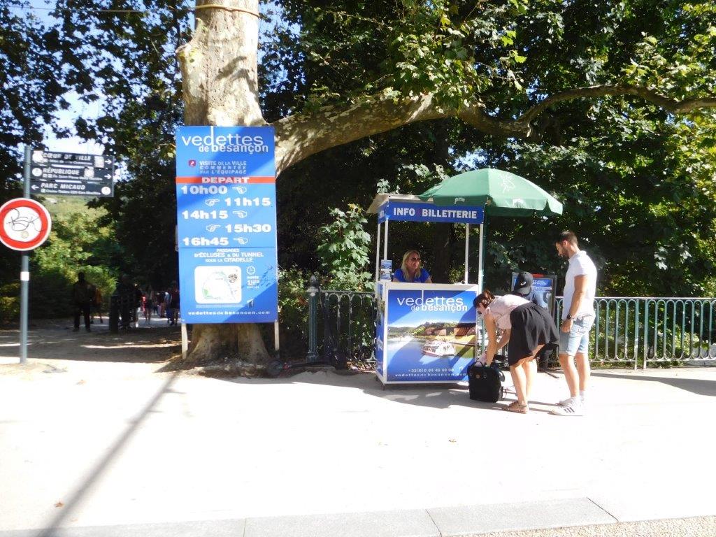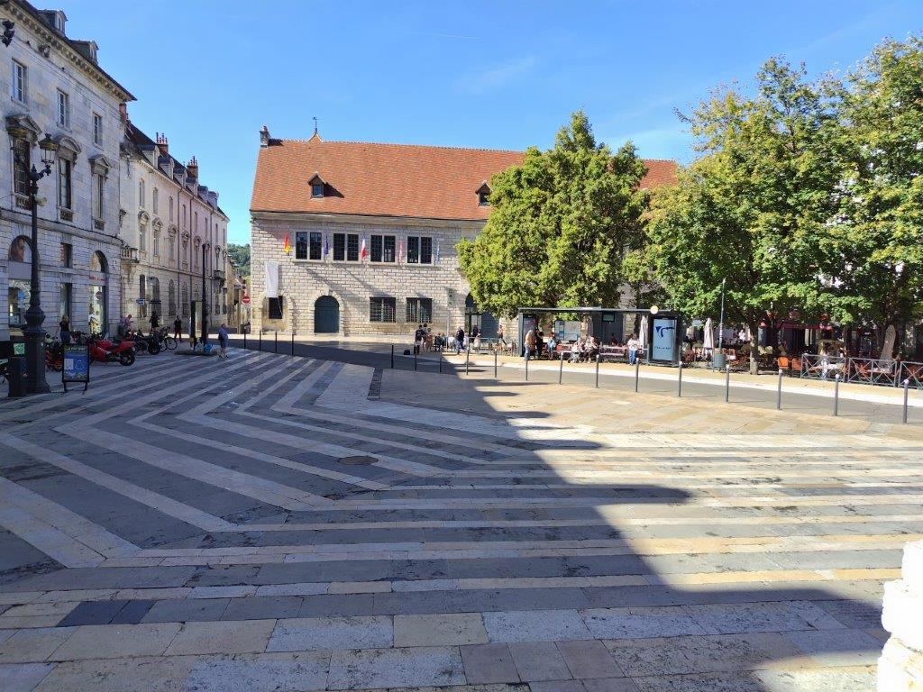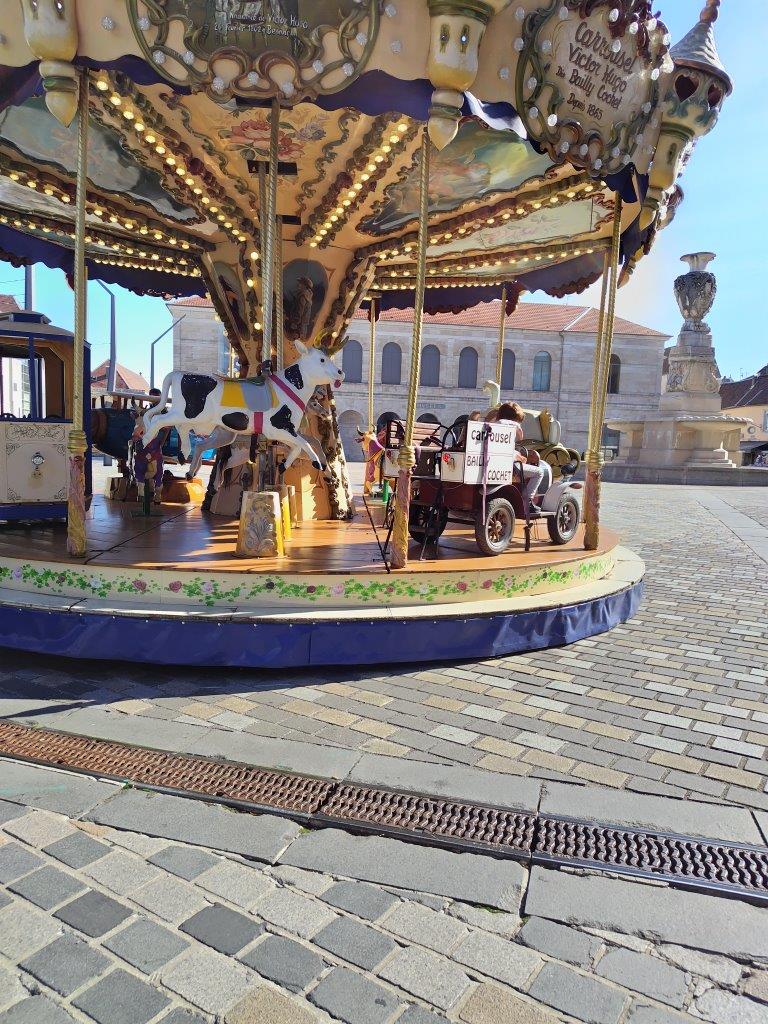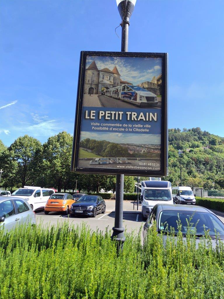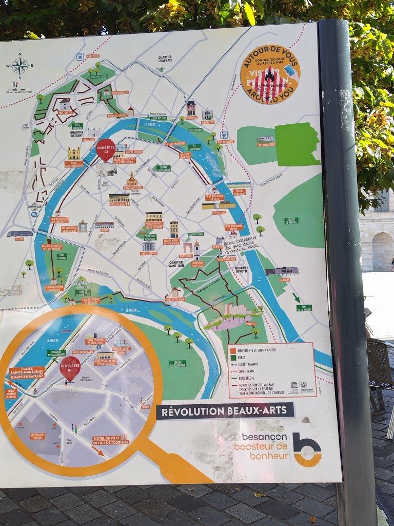 このメリーゴーランドがあるのも、どこかの広場だったと思う。多分右下のサンペーター教会のある広場かも。そしてこんな看板が。。ブザンソンはドゥー川と城壁に囲まれてる要塞都市だということがよくわかる。トラム乗ったかな。。。結局ブザンソンでは乗ってない気がする。次にサンペーター教会へ。ここの前にプチトランが止まっている。 |