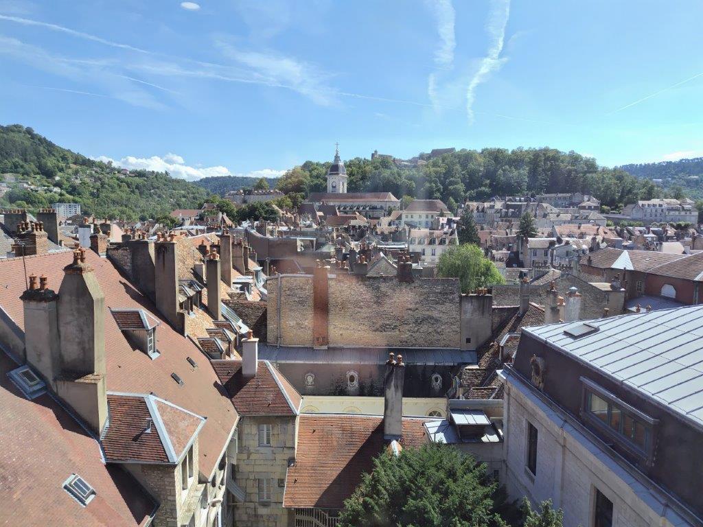 時の博物館の上まで上がるとブザンソンの街並みが見える。フィリップ善良公の塔の上からの景色に似てる。他にも時計を色々見てフーコーの振り子のマグネットをお土産に買った。 |