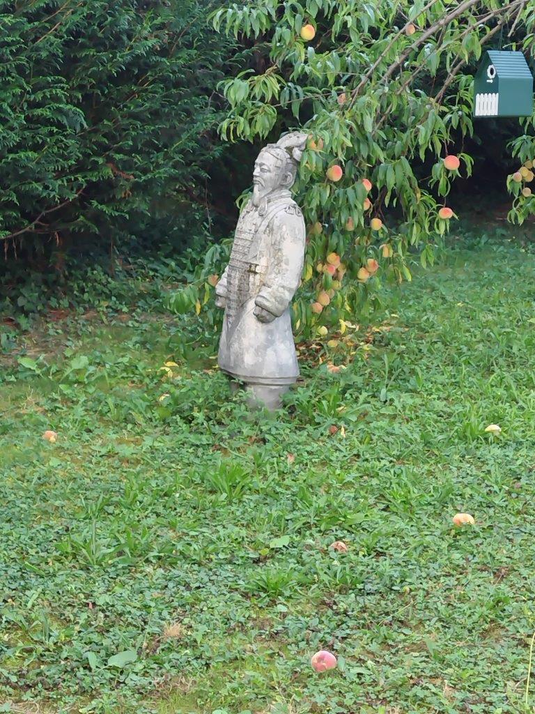 先生の家の裏庭にはバーベキューセットがあって、この煉瓦を積むのは自分でやったらしい。フランス人ってほんとDIYがすごい!そしてこの石像はホームセンターで日本人だと思って懐かしくて買ったらしく、これは中国人だよーと言うとショックを受けてた(笑)裏庭に桃がなってる。 |