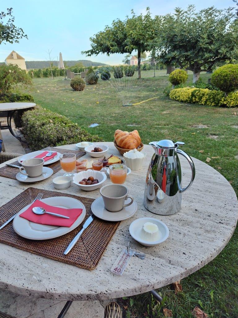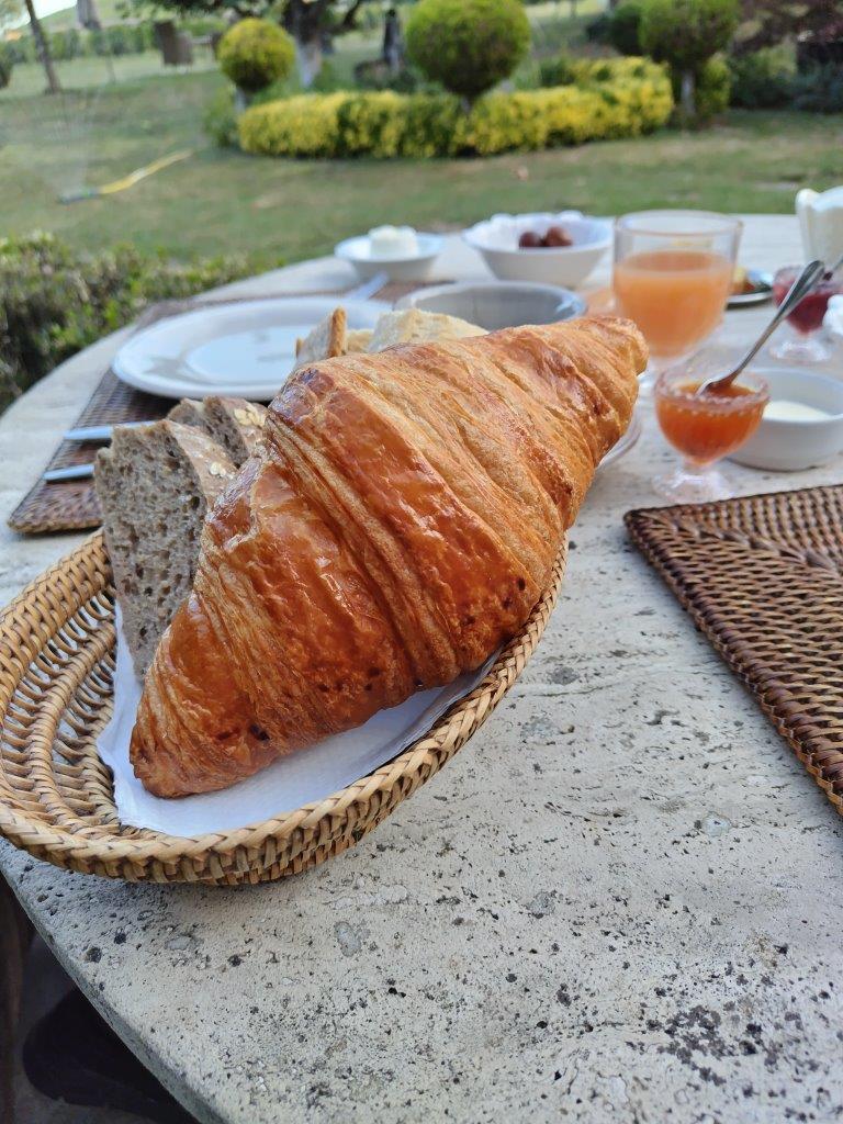 ヴィラ・ルイーズの朝ご飯。コルトンの丘を見ながら食べたかったけど、昨日ワインを飲んだテーブルにはセットされてなかったので、適当に座った。ここの朝食はバイキングではない。ヨーグルトとか、ハムとかチーズなどが運ばれてくる。クロワッサン美味しい。 |