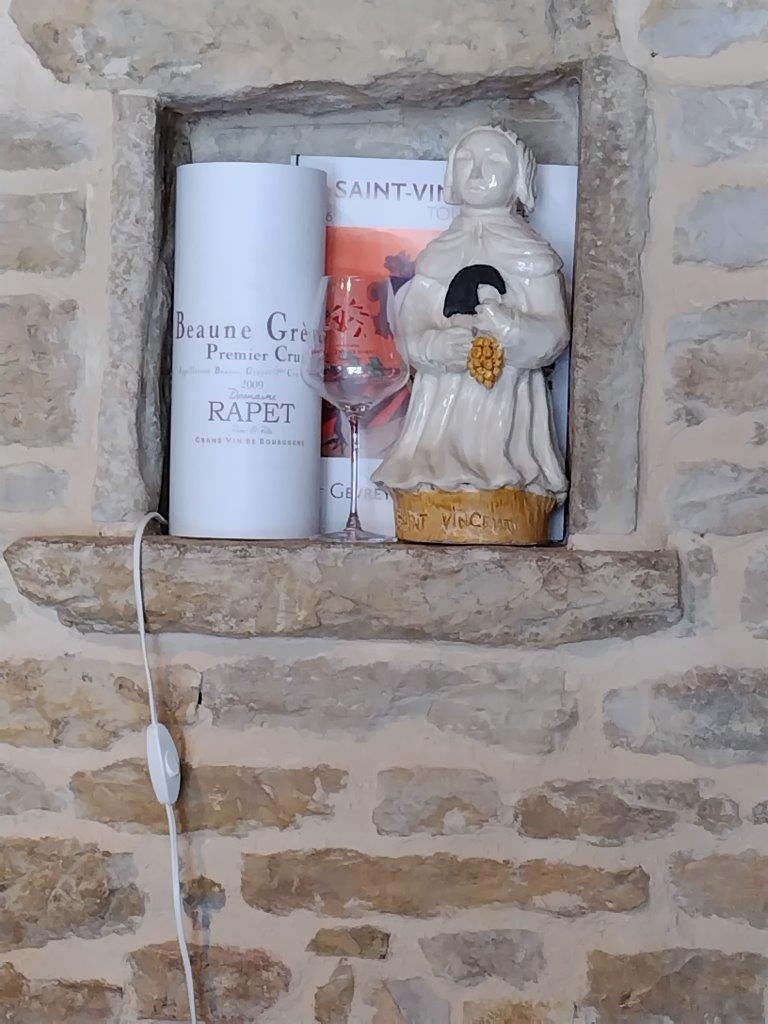 ちなみに今はモトックスでは取り扱いがなく、ファインズというサントリー系列の会社としか取引はしていないよう。マダムもとてもいい人で、幸煎餅のお土産を持っていくととても喜んでいた。しかし、なんでペルナンヴェルジュレスを買わなかったのか・・・謎。そして、このドメーヌ・ラペのエチケットや、村の境界線にもあるこの人形はワインの守護聖人でサン・ヴァンサン。これをエチケットに取り入れるとはさすが歴史のあるドメーヌです。 |