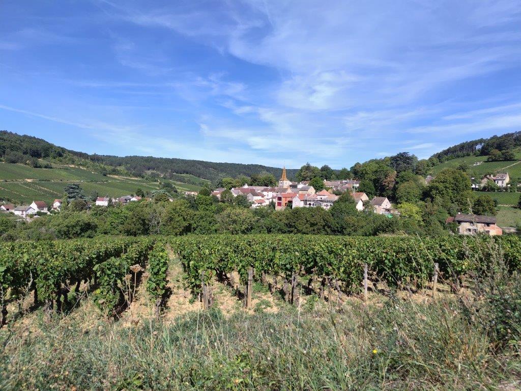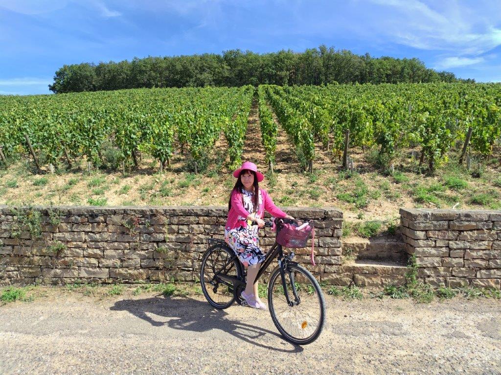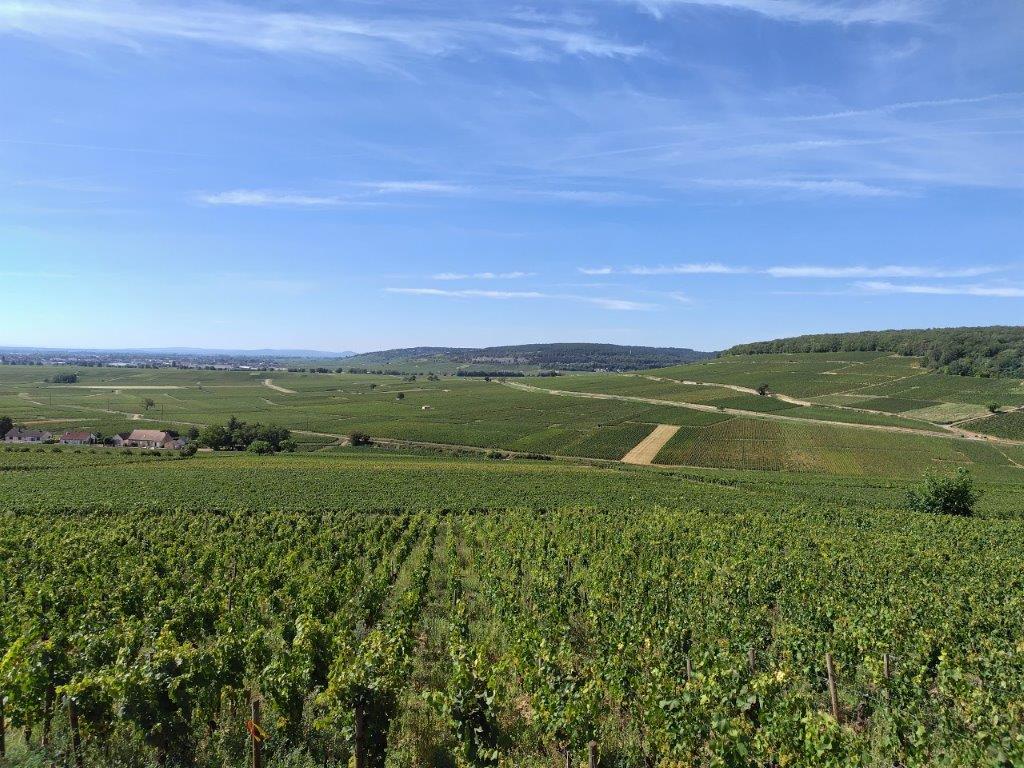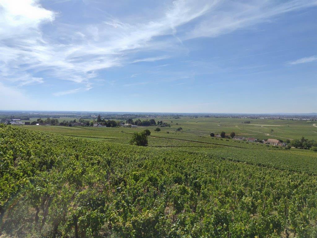 ホテルの近くまでいったん戻ってきて、さあここからボーヌまで自転車で!コルトンの丘が遠くに見える。 |