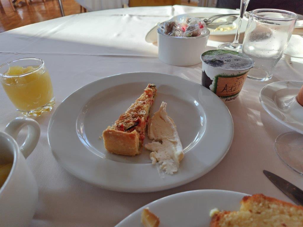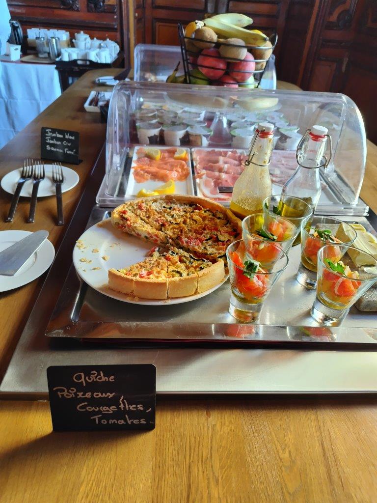 ムルソーの朝ご飯。ここのホテルはブュッフェ方式。そして、朝からクレマン飲み放題♪それもピカメロ!やっぱりブルゴーニュはピカメロさんやね。昨日も夜遅くに食べて飲んでるのでそんなにのめないけど、せっかくなのでワインに合うようなものをチョイスして2杯ほどクレマンを飲む。 |