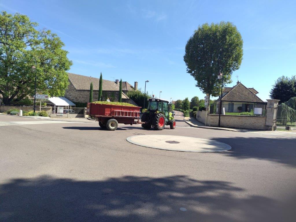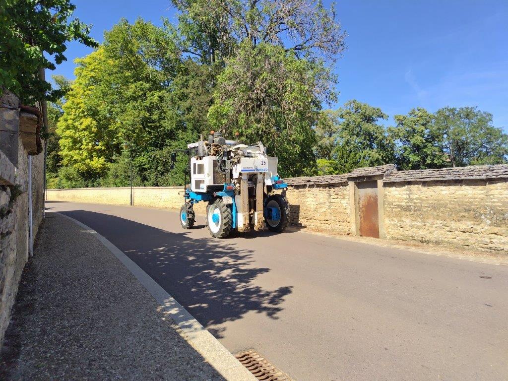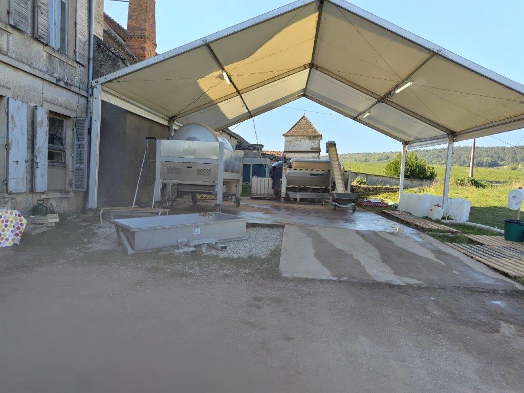 をもらったので行ってみた。まさに圧搾中みたいな感じだった。中にはFICHERの収穫機みたいなのも置いてあった。一通り樽とかも案内してくれて、さすがにムルソーの試飲はなく、まさに昨日入れたアルコール発酵させる前のジュース状態のプルミエクリュ・ポリュゾーを飲ませてくれた。 |