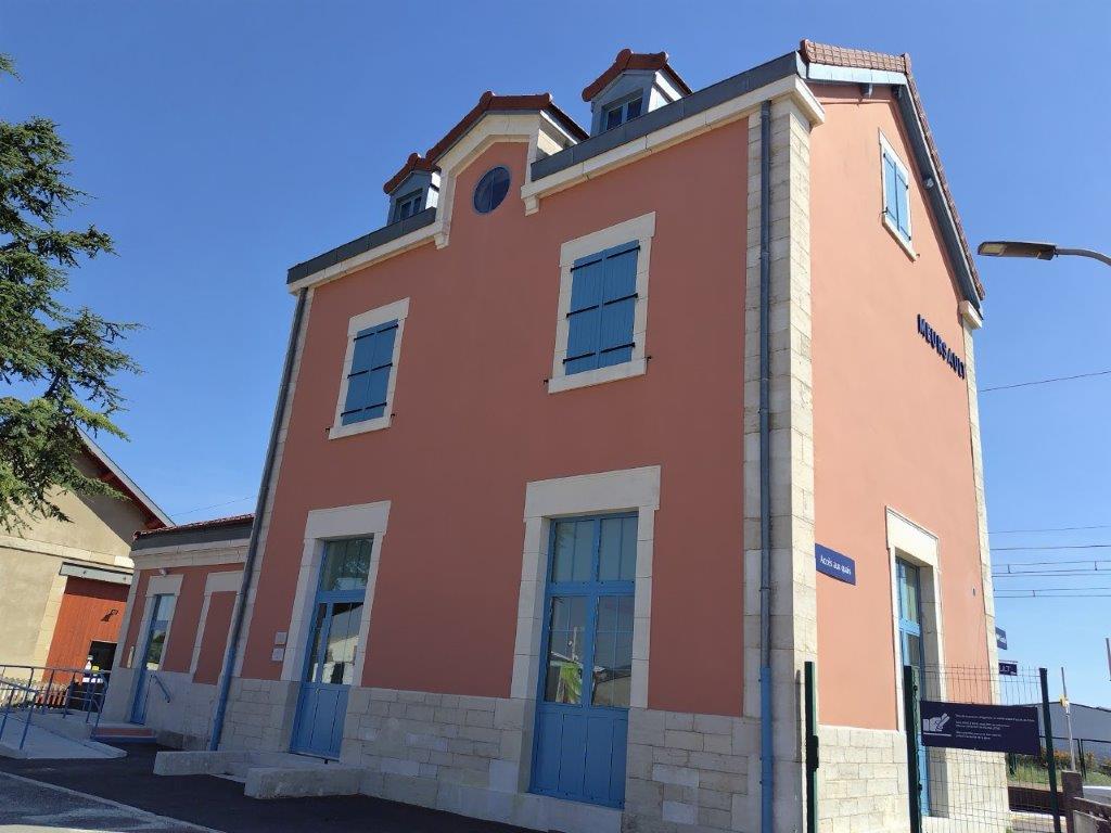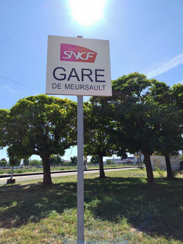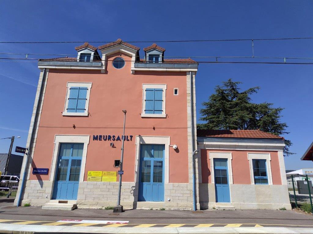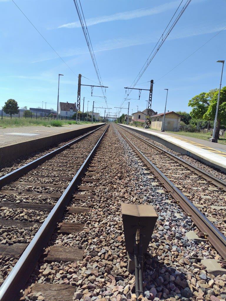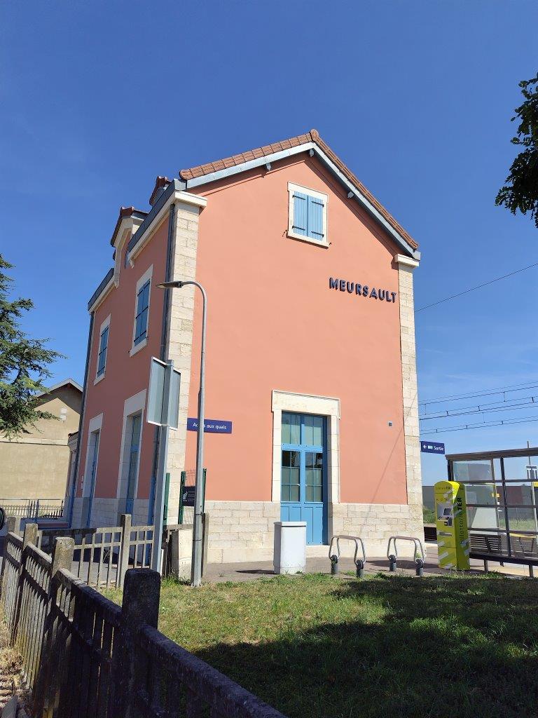 あとは、のどが渇くので水とかコーラとかジュースとか色々買って、またいったんホテルに戻って車を取りに行く。次に行くところはまずムルソーの電車の駅。フランスの駅舎って何でこんなにカラフルで可愛いのか。普通に線路内に立ち入れるので線路のど真ん中から写真を撮ってみたりした(笑)右はホテルの部屋の窓からの風景。いいお天気! |