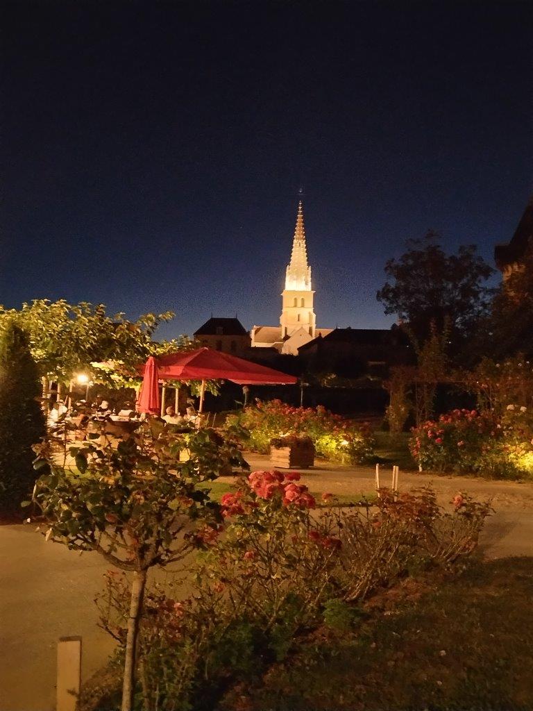 ベルギー人の犬連れたご夫婦が隣のテーブルに座っていて、私たちが3脚で写真を撮ってたら、撮ってあげようと言って、何枚も撮ってくれた。親切な人だった。部屋に戻る時に撮った教会のライトアップがきれい。結局この教会には入れなかったなあ。 |