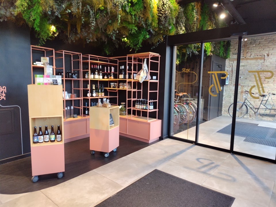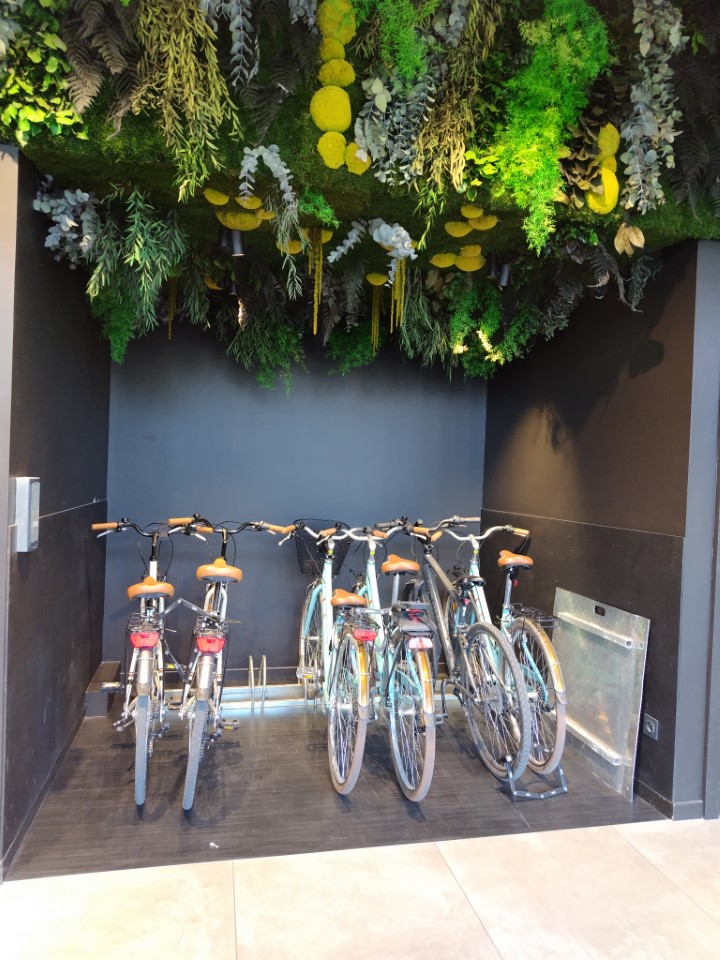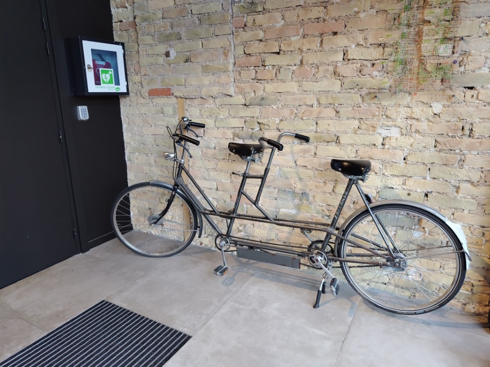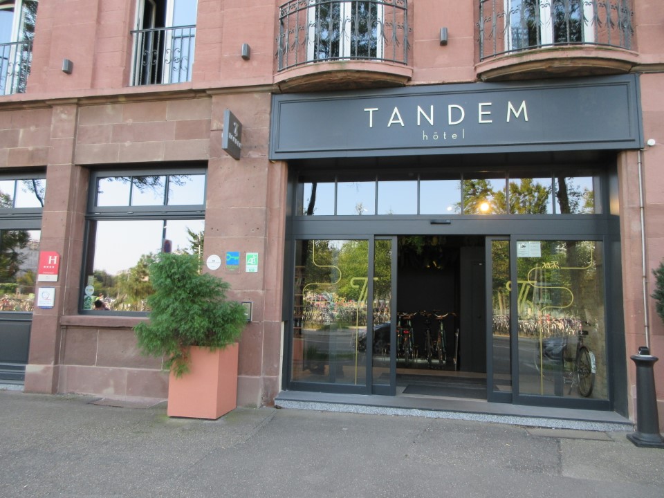 ここのホテルの名前の「タンデム」は2人乗り自転車の意味なので、あちこちにロゴマークがあったり、実際にタンデム自転車が置いてあった。2人乗りではないけどレンタル自転車もある。ワインも売ってる。 |
