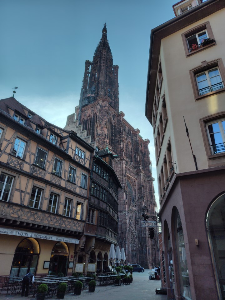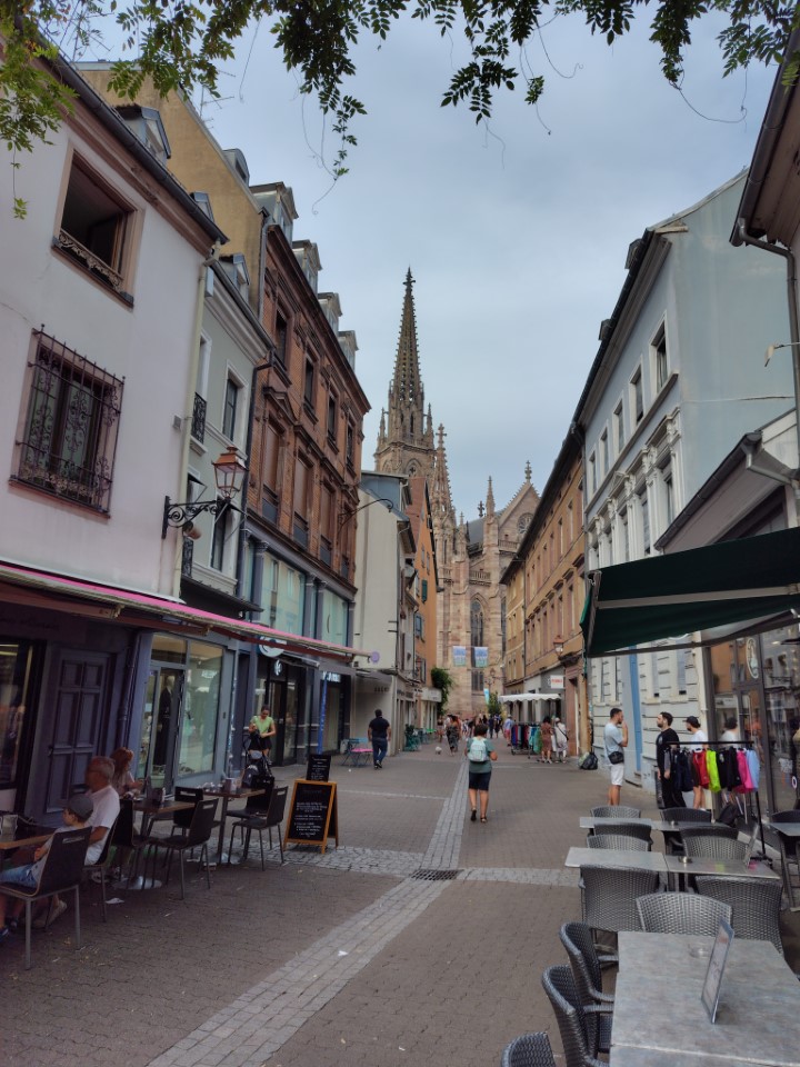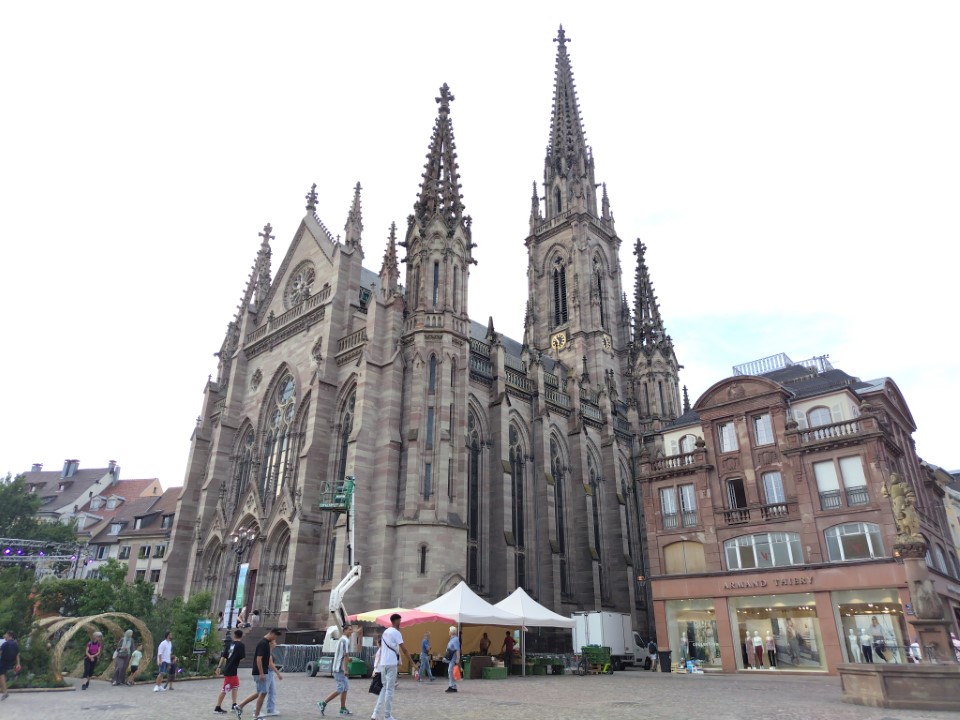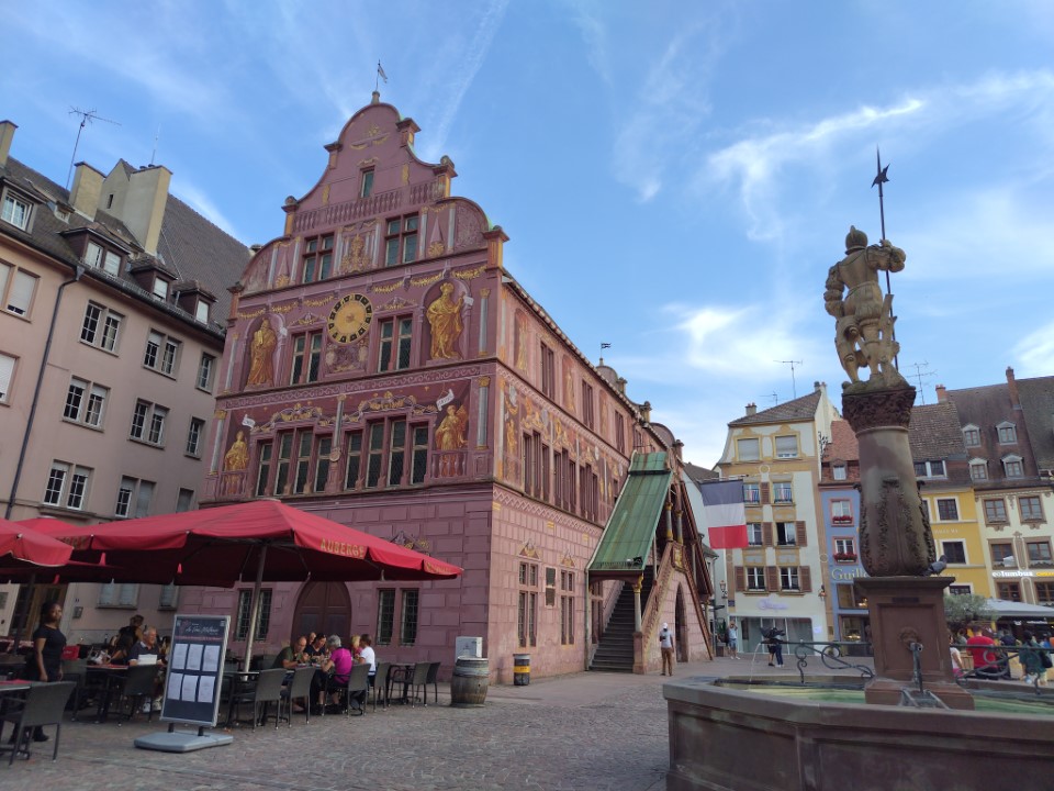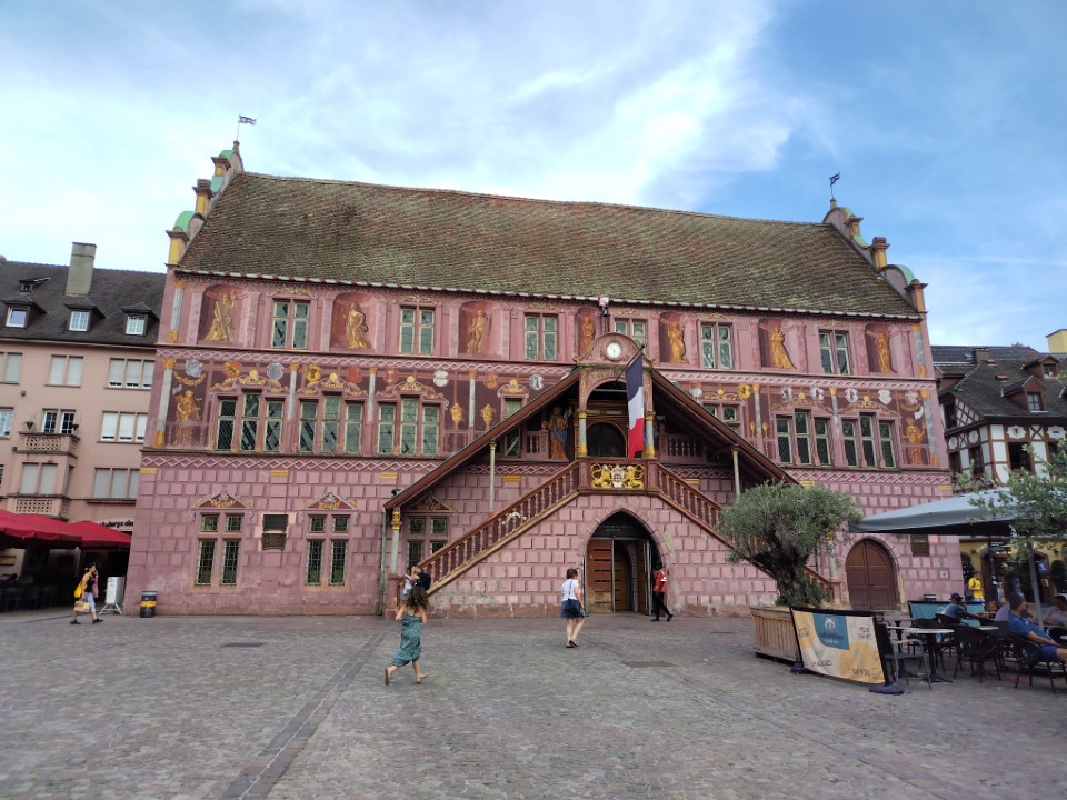 この立派な建物はサンティティエンヌ寺院。ここの中にも入ったけど、写真がないのは何故かな。なんか、中でイベントとかやってて、建物は立派やったけど、中身は撮影するほどではなかったのかも。このピンクの建物は旧市庁舎。今は博物館になってる。2枚目はこの正面の階段を上がったところから撮った写真。右正面に寺院が見える。旧市庁舎は16世紀ルネサンス様式の建物で、特徴的な木組みのファサードが目を引く名所。広場に面し、市の歴史を感じさせる美しい外観が楽しめる。この辺にしか人が集まってなくて、他のところは閑散としてる。 |