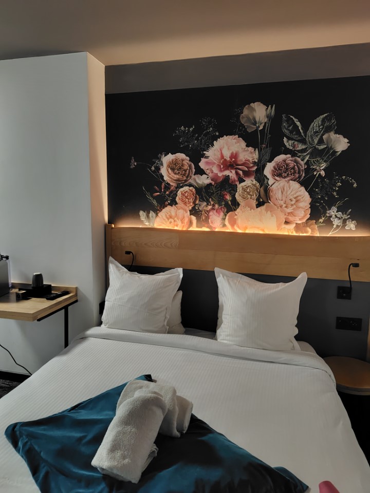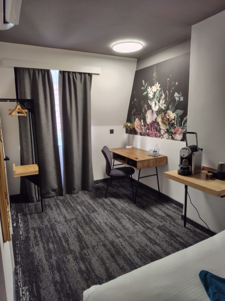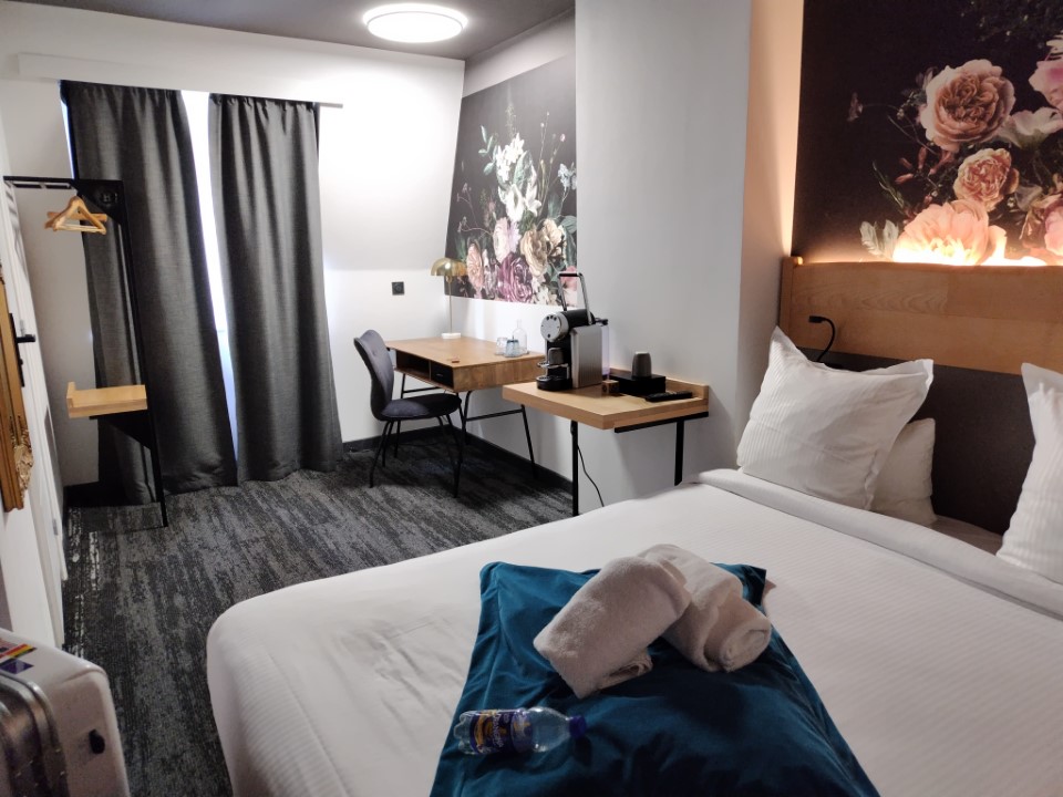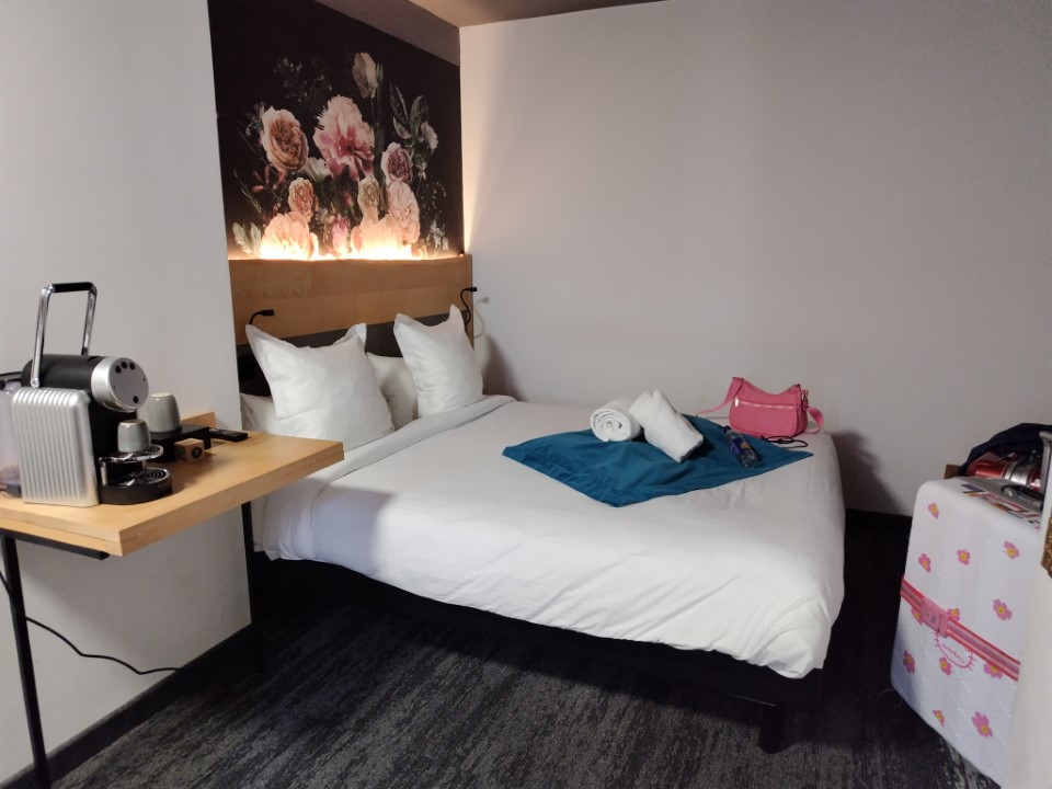 アルベール・マンからホテルまでは43kmくらい。駅から近い可愛いホテルがあったのでそこにしたけど、よく考えると車移動なので駅から近くなくてよかった。。駅から近いのでホテルに駐車場がなく、indigoのPまで結構遠くて疲れた。部屋は奥まったところにある結構広めの部屋でモナリザがフーセンガムを膨らましてる絵が飾ってあって面白い。 |