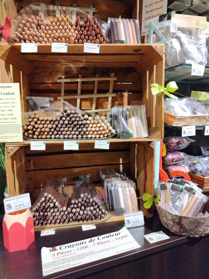 これも、アルザスで見かけるチョコレートやさん、ジャック・ボッケル。この鉛筆型のチョコが美味しい。5年前コルマールのお店で見たときはもっと色々な色があったのになあ。でもとりあえず買っておく。コスパのいいチョコレートやさん。 |