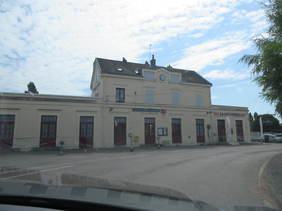 高速を出たところにようこそニュイサンジョルジュへ的なオブジェが。2枚目の駅の写真は、電車からよく見た駅の反対側!そしてホテルは町の中心地にあるイビスにした。1階なので移動が楽。さすがニュイサンジョルジュのホテルで、樽とか置いてたりワインも売ってる。 |