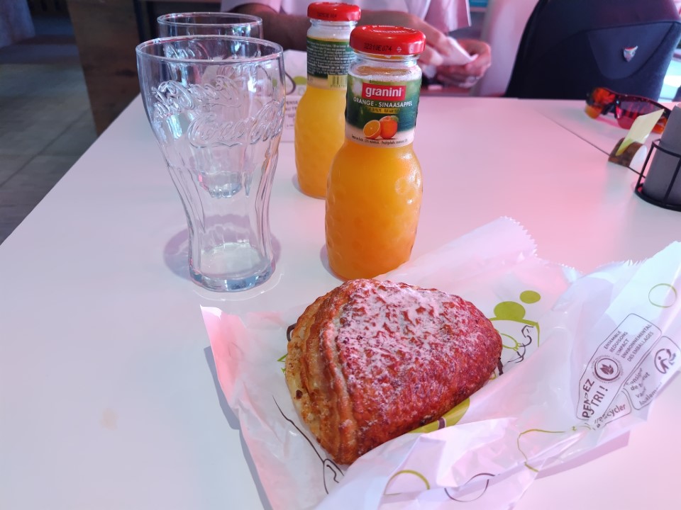 たとりあえずホテルに戻ってパンを食べる。ロビーでオランジーナを注文♪そして、ガソリンを入れに行った。 |