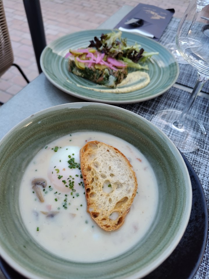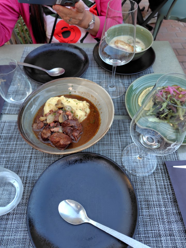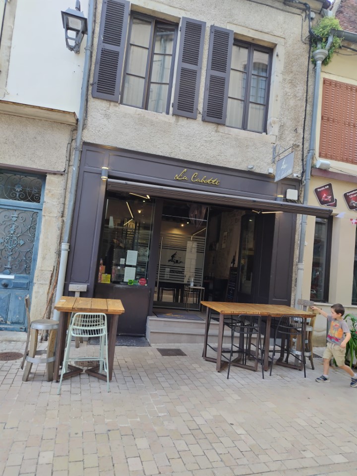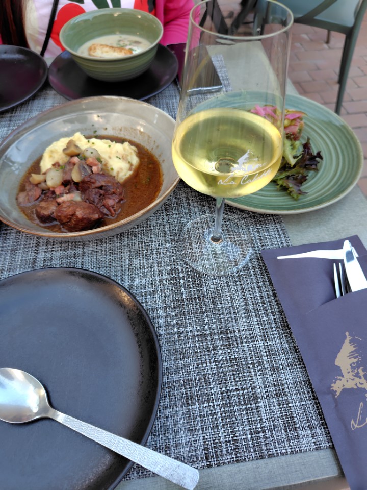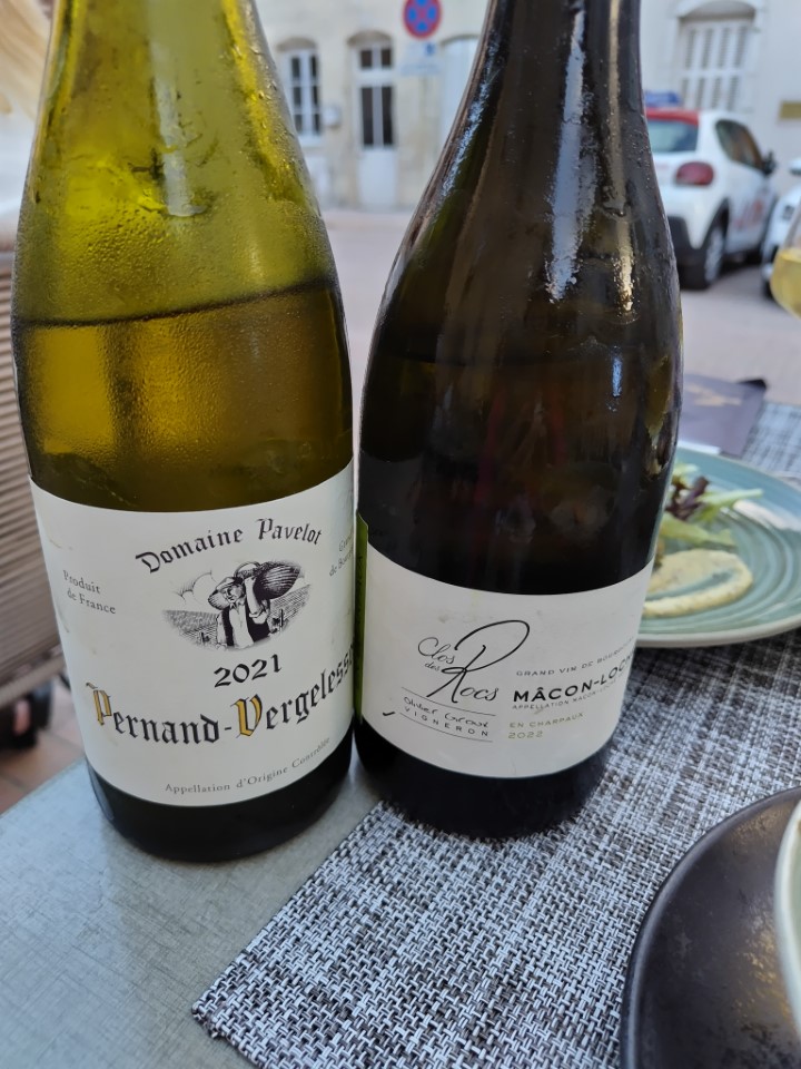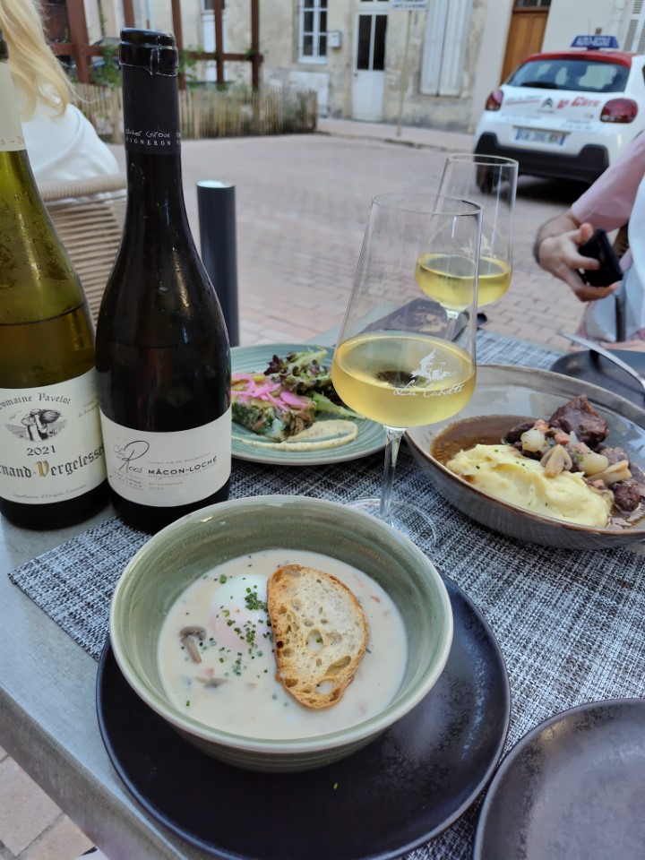 そして今日のディナーはCabotte。ここなかなか美味しかった。特にこのポーチドエッグのシャルドネソースというのが、スープ仕立てですごく美味しい、メインはシャロレー牛のブッフブルギニヨンにした。ワインはマコン・ロシェとペルナン・ベルジュレスにした。 |