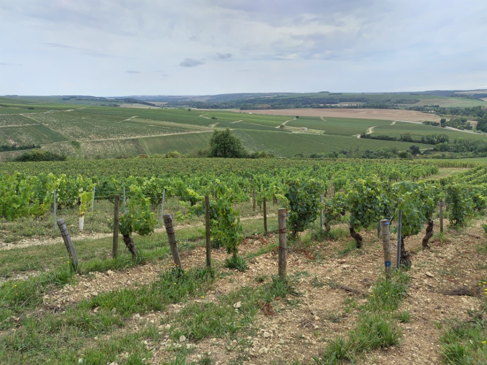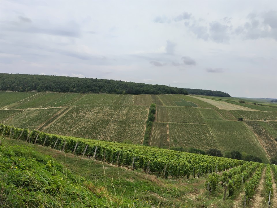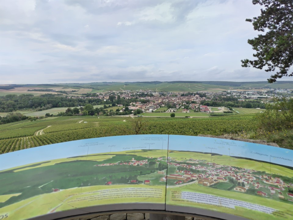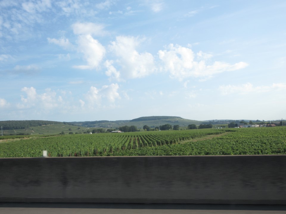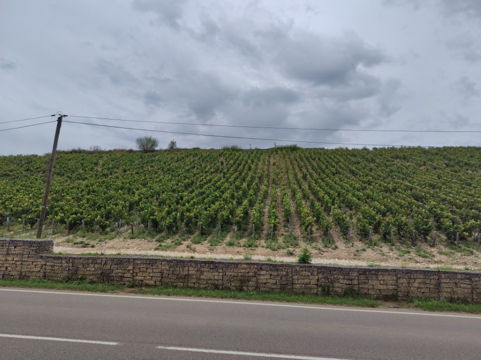 さて車を75km走らせてシャブリへ。途中またシャロレー牛の大群を見た。まず最初に行くところには、シャブリの町が見渡せる見晴台へ。車を降りると雨が止む。今回の旅行は車内で降ってても外に出ると止むのでなかなかラッキー。この辺はブランショの畑! |