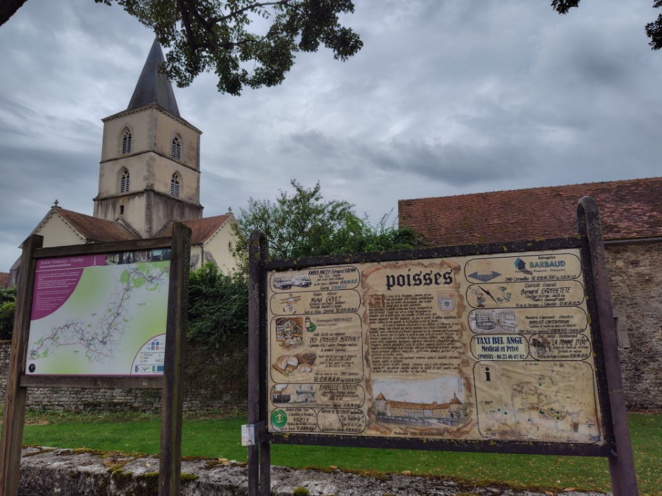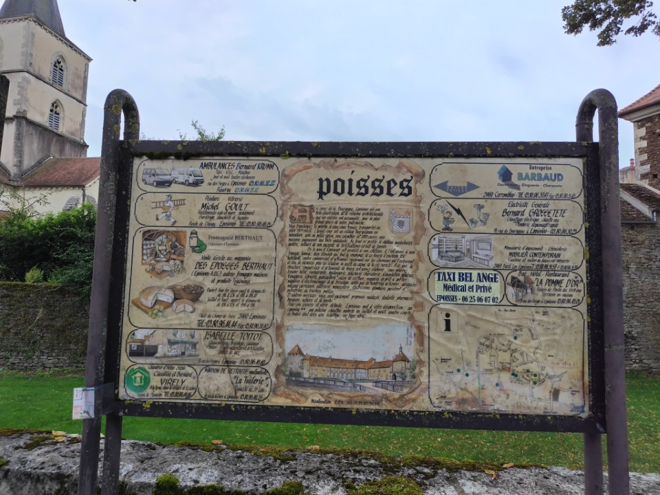 ベルトー社の看板出てる!そしてエポワス城へ。まず教会があって、町の案内板もおしゃれ。 |