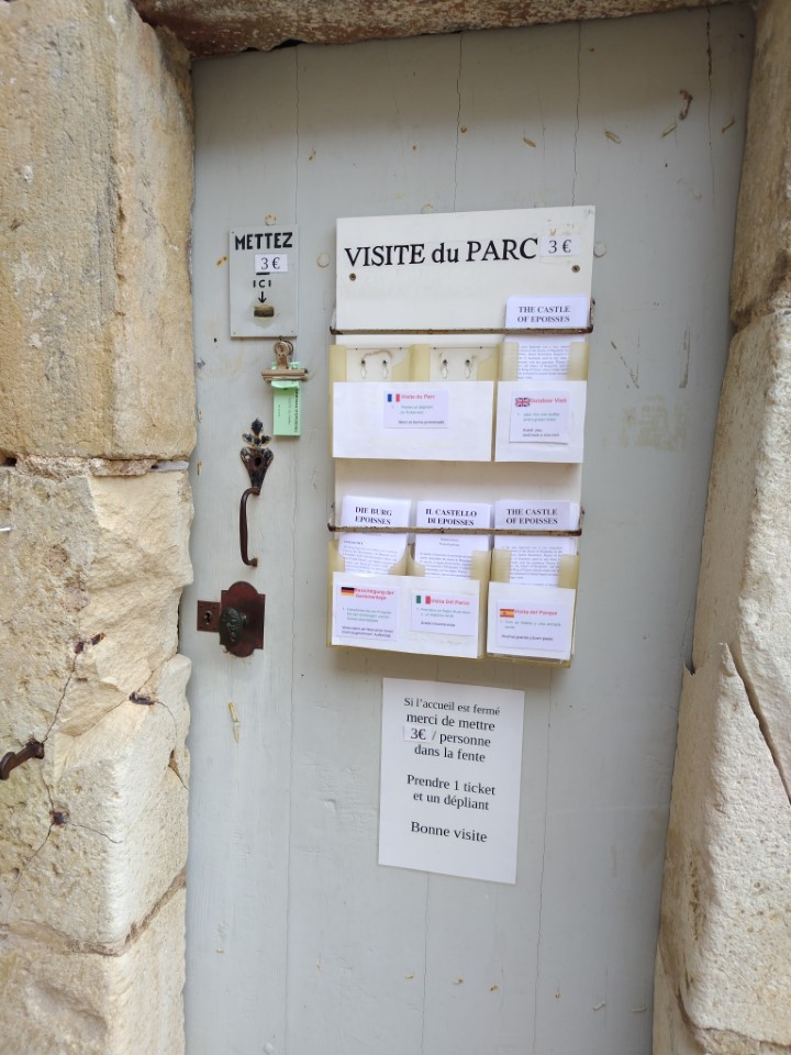 んこの一番右上の建物がエポワス城で、正面から見たらそんなすごいお城だとはその時わからず、priveeって書いてたので私有地で入れないと思ってた。人が住んでるって何かで見たので、小さなお城と思ってた。ところが、この旅行記を書くために色々調べてたらすごく立派なお城で見学も出来るみたい。ものすごくショックを受けた。行ったのは9月3日。9月1日から10月31日までは事前予約すれば中も見学できたみたい。。。ガーンと思ったけど、火曜日は休みで、9月3日は火曜日だった。事前予約してもどのみち見学は出来なかった。ただ、とこかからお城の正面玄関を見ることは出来たかもな。 |