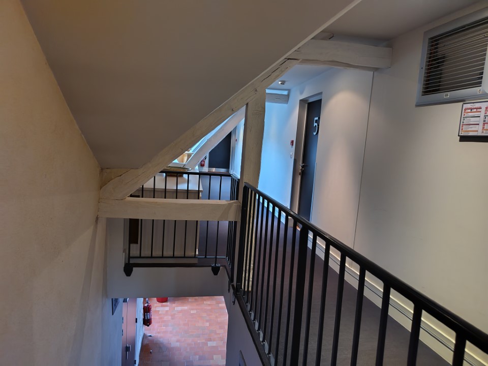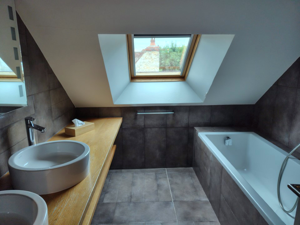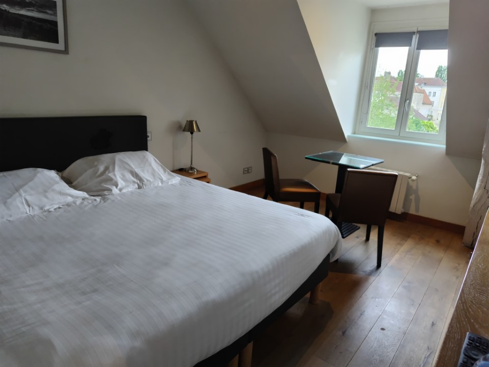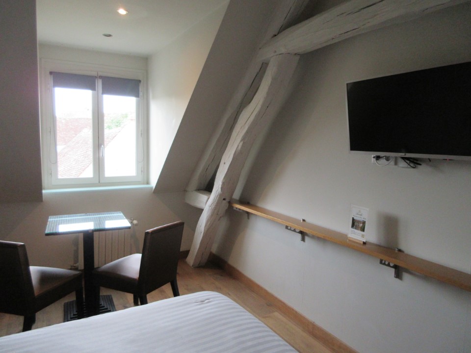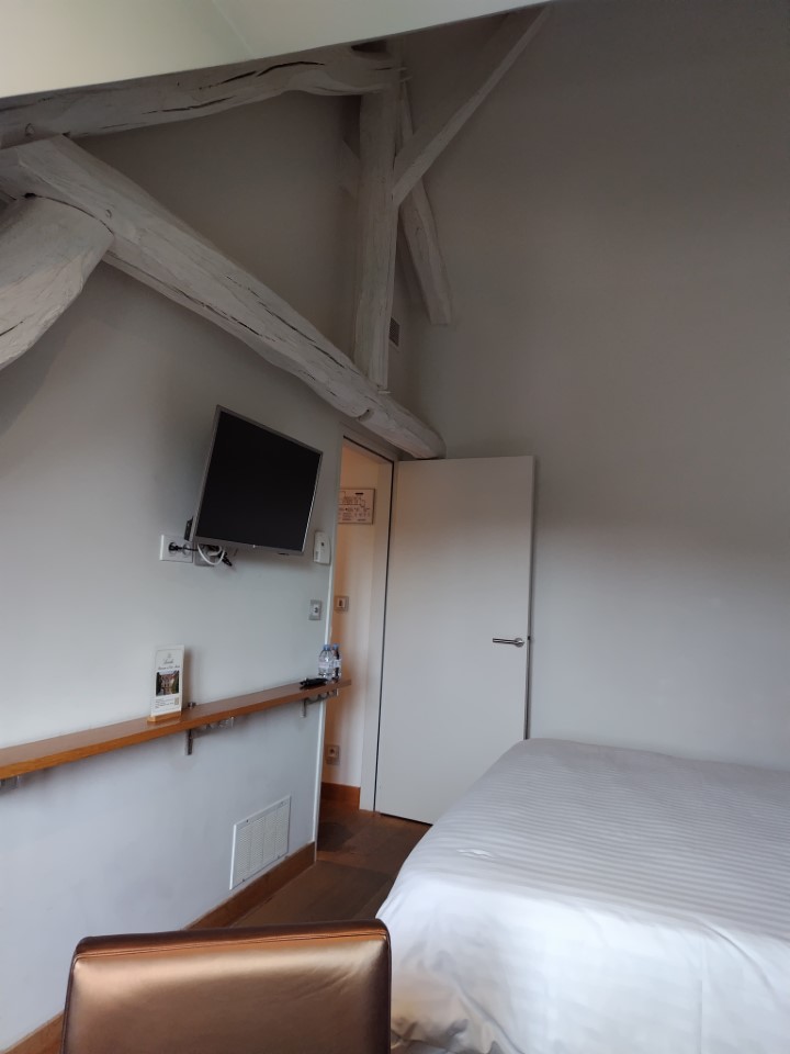 次にホテルへ荷物を置きに行く。ホテルは町の中にあって駐車場がないので、ホテルの近くにある無料のパーキングに駐める。ここからスーツケーキをごろごろ引っ張っていく。まずホテルの入口は閉まっていて、メールで届いたパスワードを入れて空ける。ボックスがあり、そこに私の名前の書いた封筒が入っていて部屋の鍵が入っている。部屋は結構いい。トイレにビデまでついてるのは、ナンシーのマリーアントワネットが泊まったというホテル以来かも。湯船もあるし、天窓もあるし、部屋から川も見えるし♪川はスラン川の支流の細い川。 |