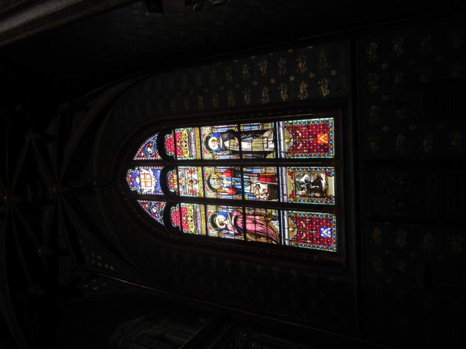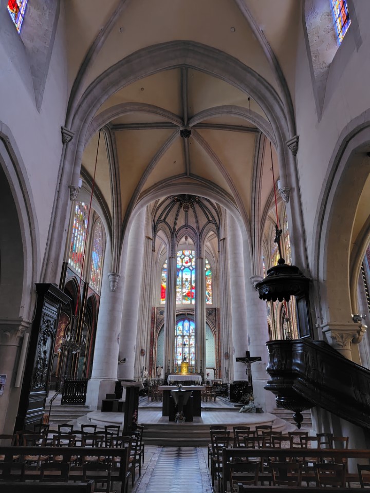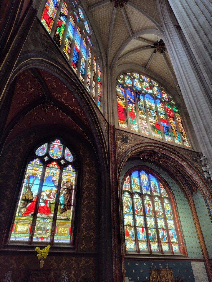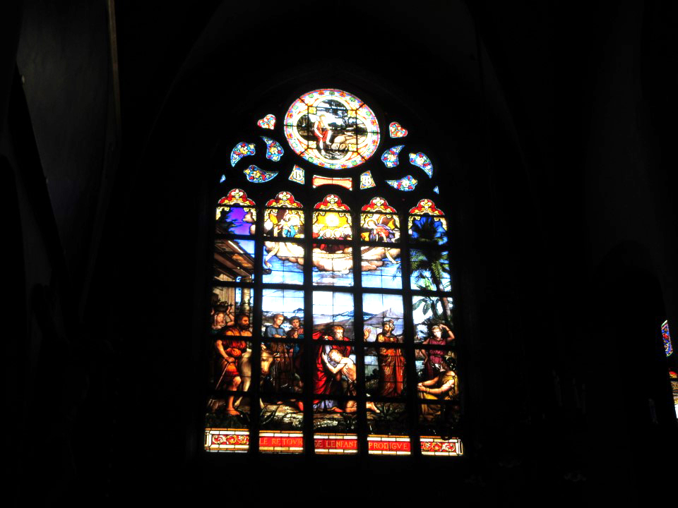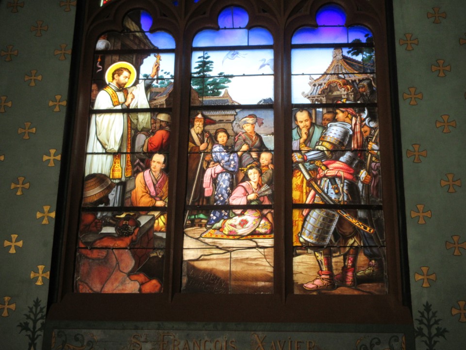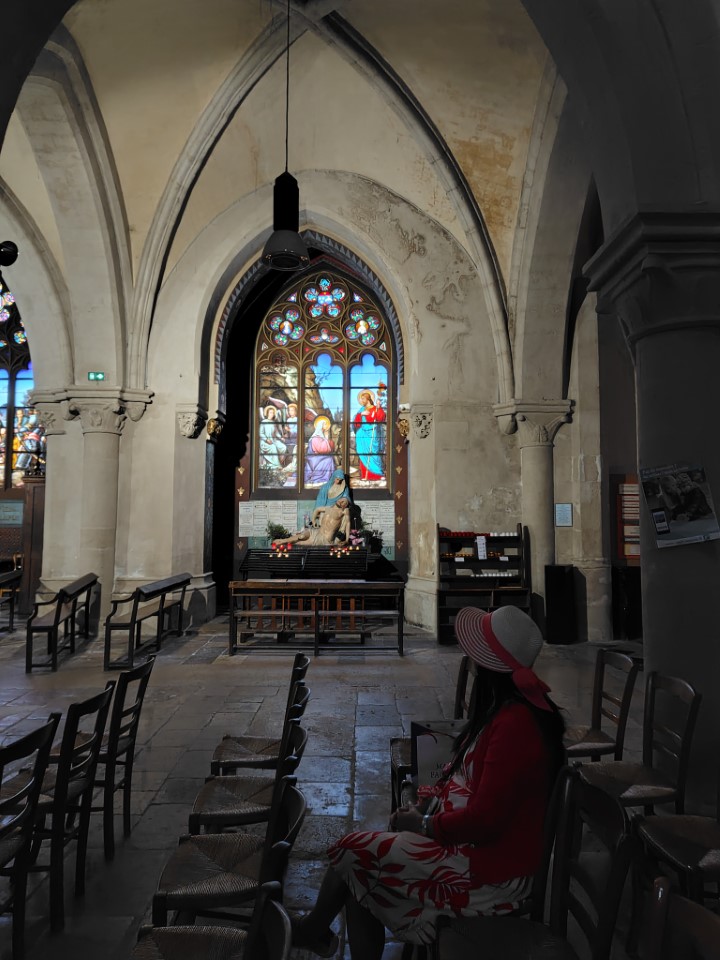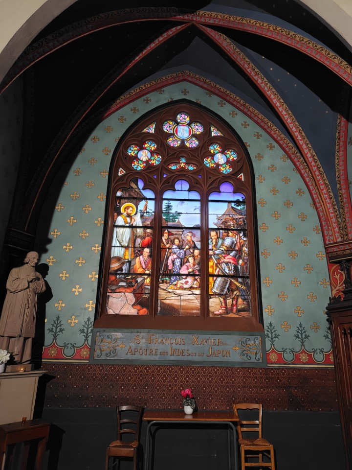 次がサントマリーマドレーヌ教会。何気なく入った教会やけどステンドグラスが見事で、日本人のちょんまげの町人が描かれててびっくり。この教会は12世紀に創建され、16世紀に完成したゴシック様式の教会です。特に注目すべきは、フランスで唯一、改宗した日本人を描いたステンドグラスが存在する点。19世紀には著名な建築家ヴィオレ・ル・デュクによる修復が行われ、ネオゴシック様式の鐘楼が加えられました。その修復時に「世界のキリスト教徒」や「日本人信徒」を題材として描かれたよう。 |
