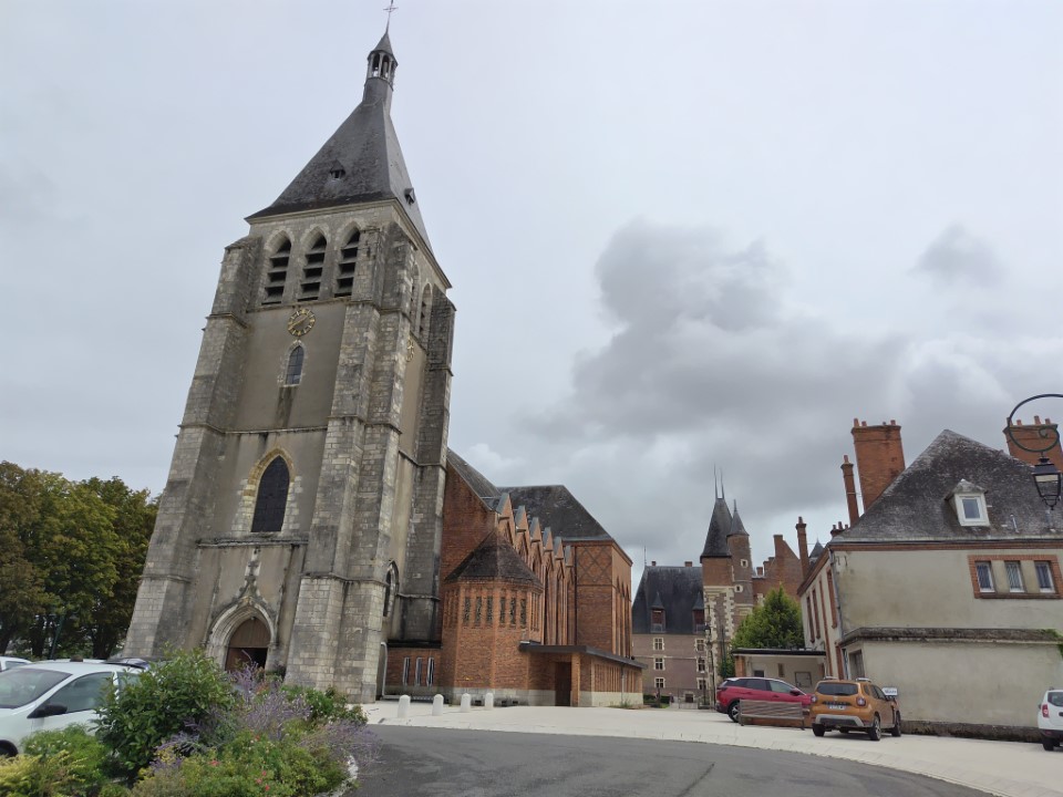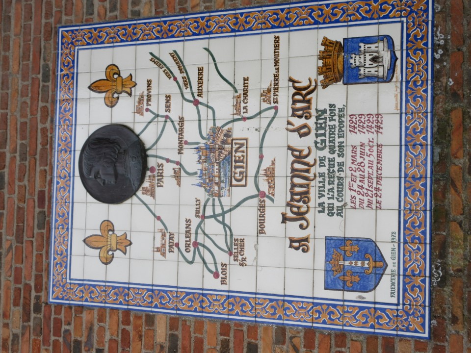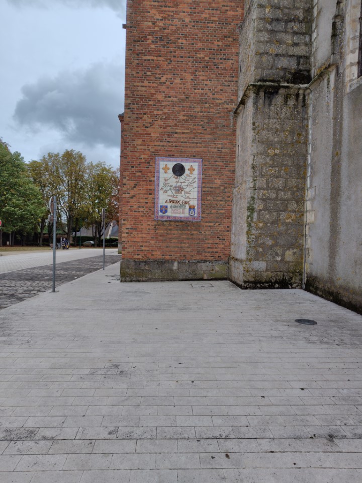 このタイルのプレートは教会の壁に飾られてて、1429年、オルレアン解放ののちジャンヌがこの町に立ち寄り、軍勢を集めるために滞在したことが記されている。そのゆかりで教会の名前がついている |