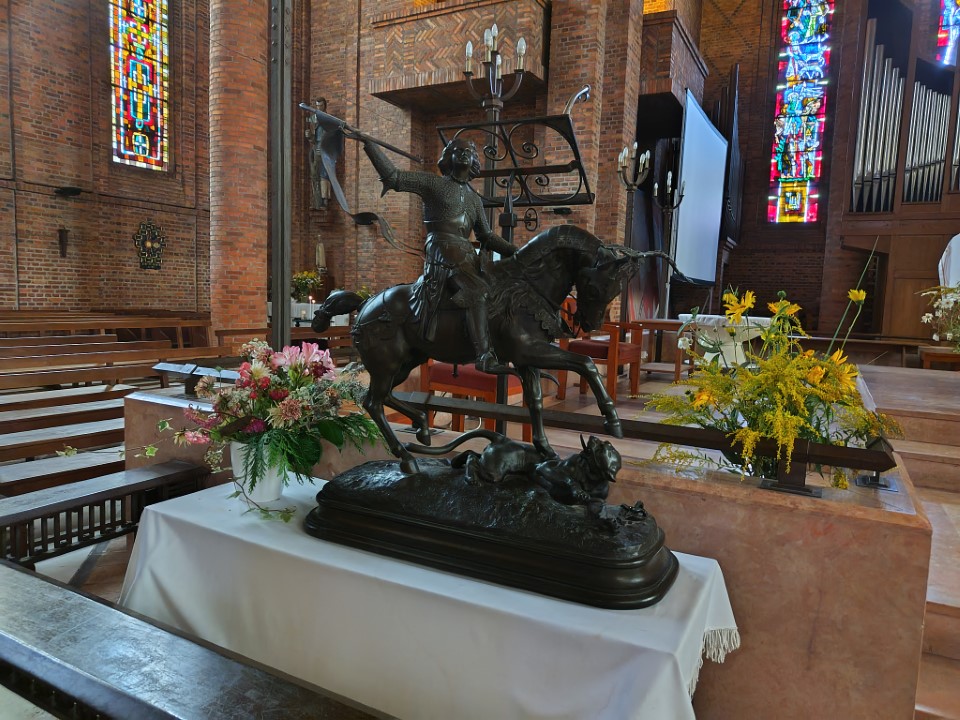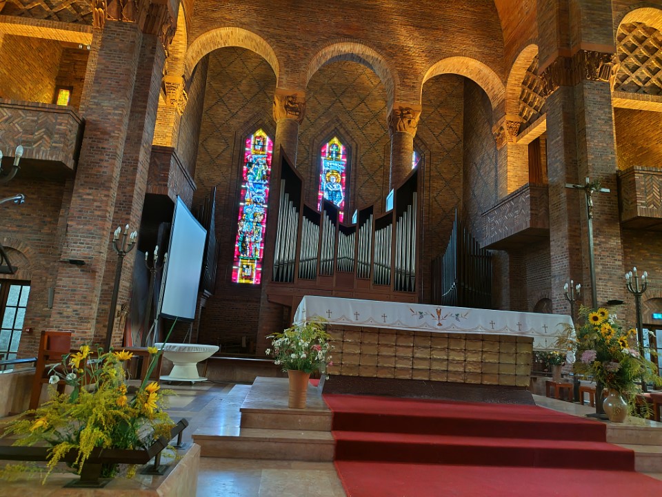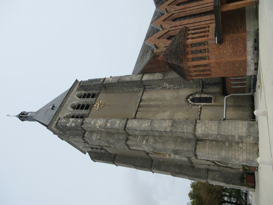 は、第二次大戦でほとんど焼失した後、1950年代に再建された教会。戦禍を免れた15世紀の鐘楼が今も残り、赤レンガと石材を組み合わせた外観は地域の伝統と近代建築が融合している。 |