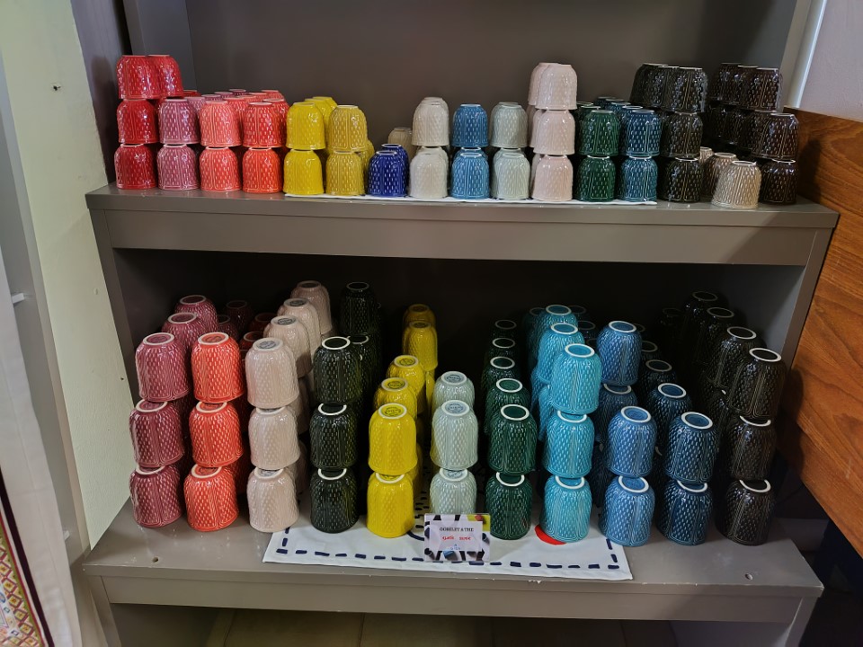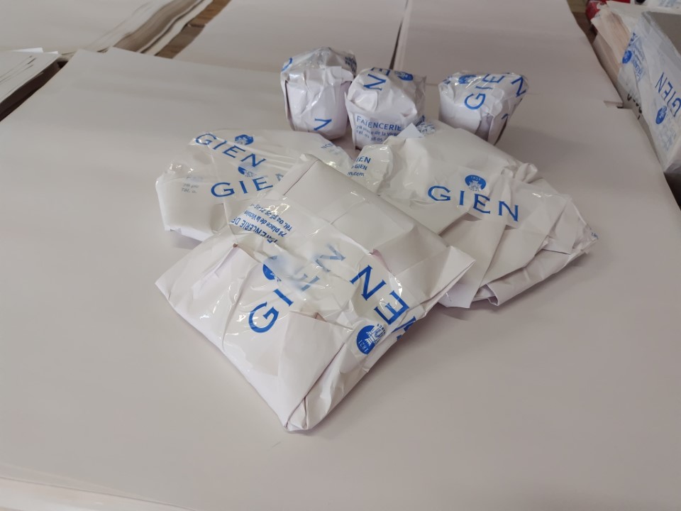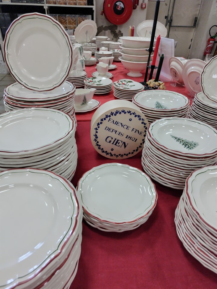 アウトレットと行ってもやっぱり高い。そして綺麗なお皿は割るのが怖いので絶対使わない。。ので実用的なもの、そして磁器婚式に合わせて、イニシャルの入ったお皿とぐいのみを買うことにした。お皿2枚とぐいのみ3つ、そしてこの小さいお皿を2枚買って、96.2€だった。包装紙が沢山置いてあって自分でお皿を巻いて、GIENのマークと文字が入ったセロテープが置いてあるので、ぐるぐる巻きにして持ち帰る。 |
