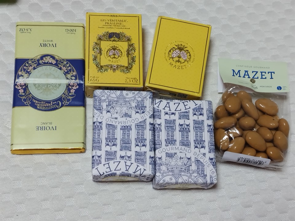3枚目の写真はティエリー・マルタンで買ったチョコとゼリー、4枚目はマゼで買ったプラリーヌとチョコレート。 |