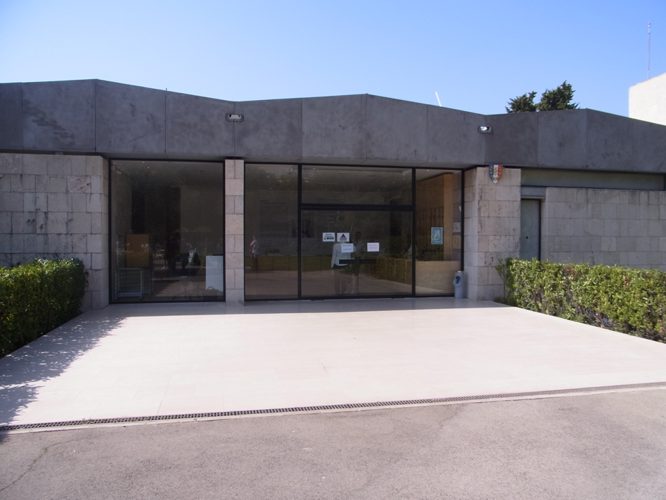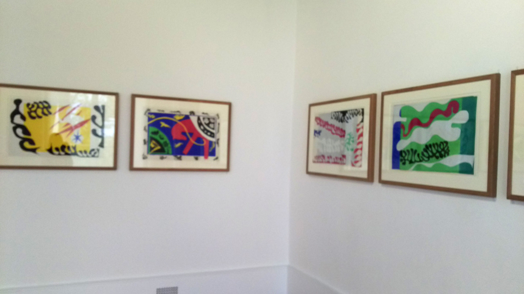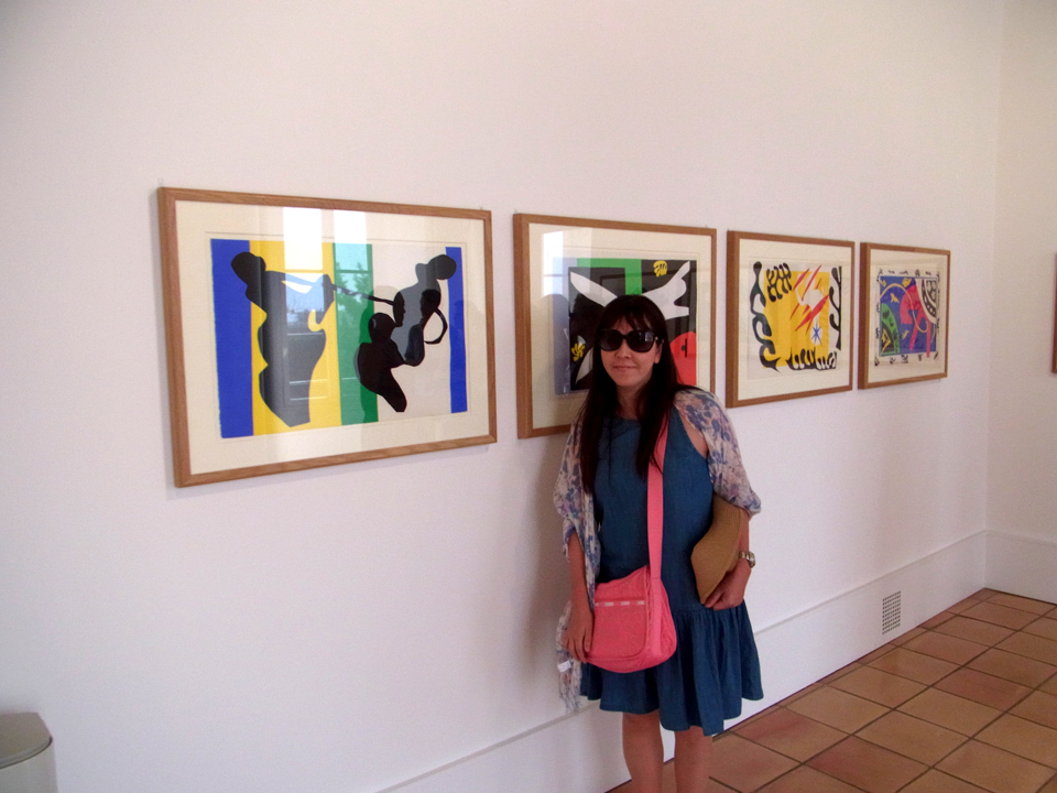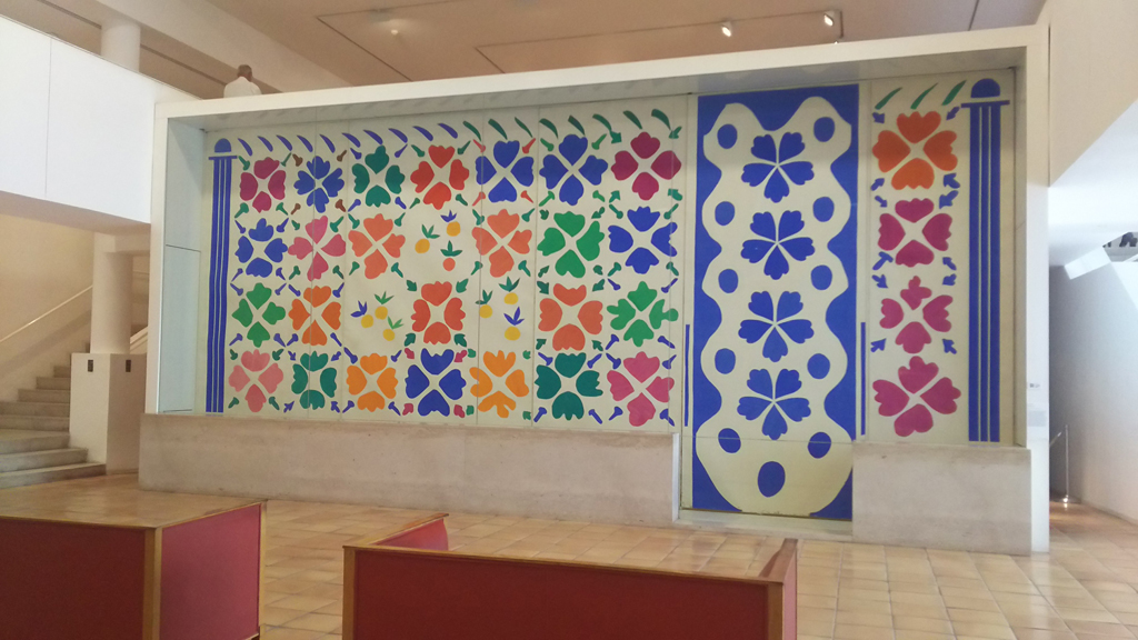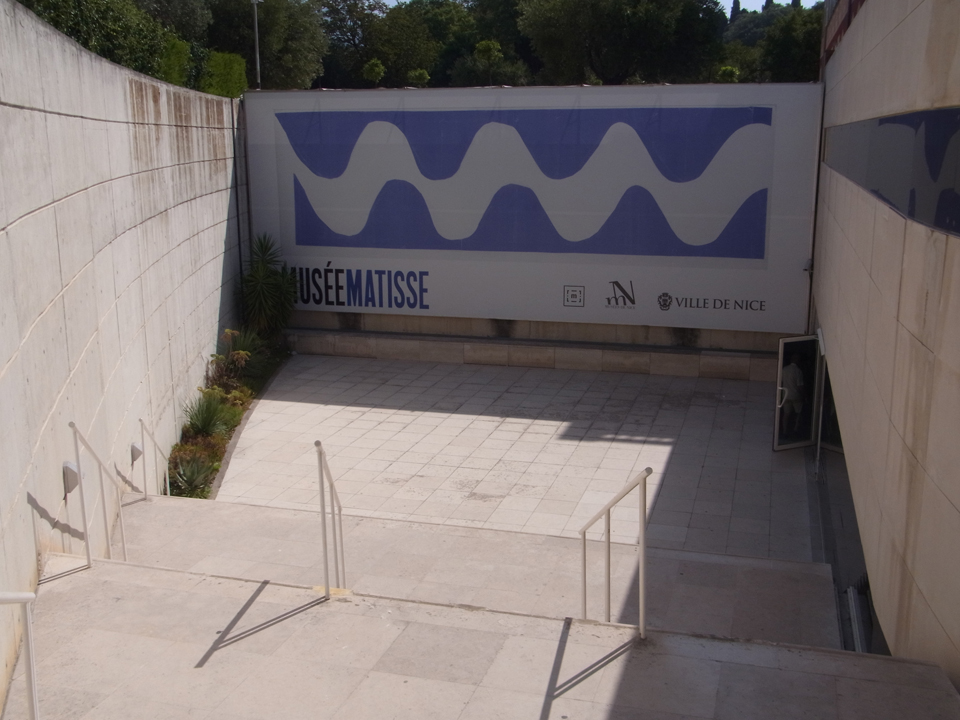 マティス美術館の建物が見えてきました。でも実はここには出口しかなくて、入り口はもっと手前にあって、こんな感じです。(右)玄関入るとカラフルなパネルがあって、マティスもやっぱり色がきれい。ただ、荷物になるのもあって、ここでは何も買わず。そして、ここもパスで無料。 |