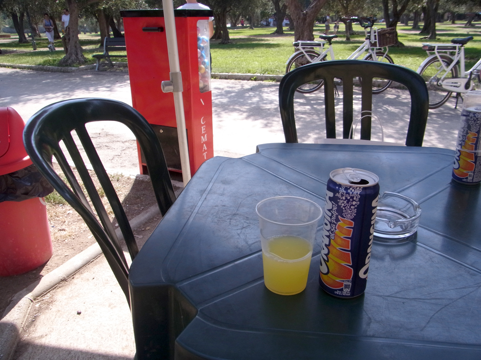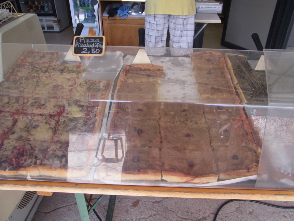 | 赤い2階建てのバスが来た!運転手にイヤフォンを渡された。座席のどこかに挿すと音声ガイドが流れるのかもしれないが、そんな余裕もなく到着。公園の中に美術館があり、カフェもあった。喉が渇いたのでオランジーナでちょっと休憩。そして、ピサラディエール発見!南仏で初めてのピサラディエール。食べたかったけど、予定にはないので断念。 |