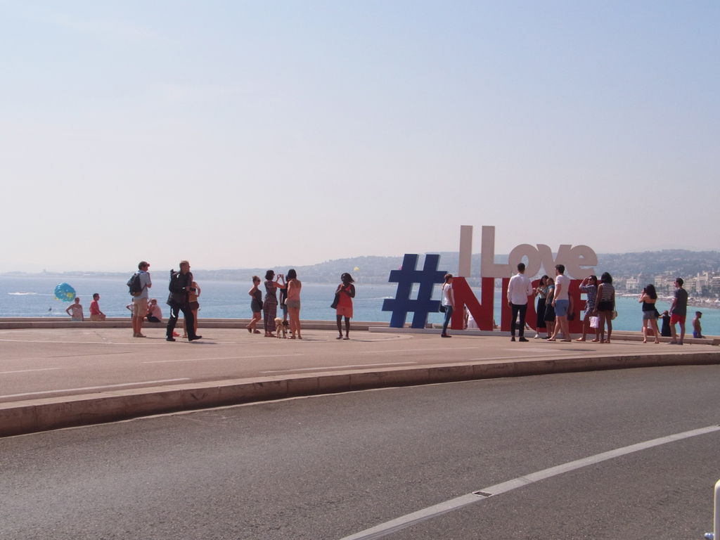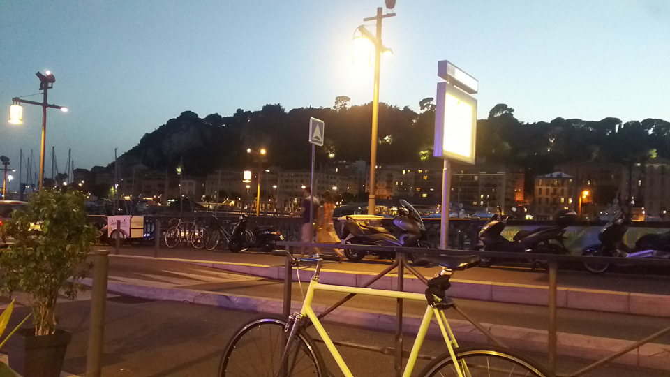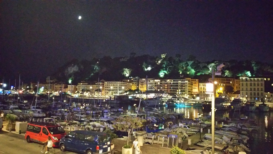 食べていると日が暮れてきて、いい感じになってきました。そして、食べ終わった頃には、港の夜景がきれいでした。ここから、トラムT1の一番近い駅までテクテク歩き、トラムでジャン・メドサン通りをいき、ホテルまで歩きました。でもフランスに行くときは9月に入ってからの方がよさそう。お店休みすぎ!あとはサン・ニコラ・ロシア正教会大聖堂もニース・ノートルダムも時間がなくて行けなかったけど、トラムから外観は何度か見れました。プチトラン出発までの間に、たまたま入ったお店でNICEと書いただーりんのTシャツを買いました。 |