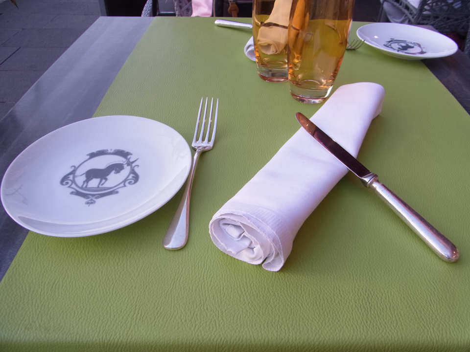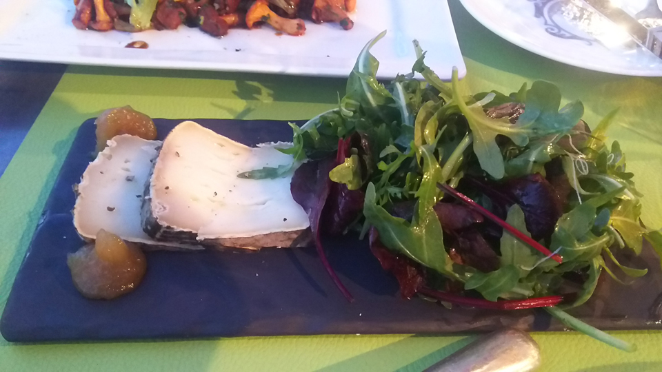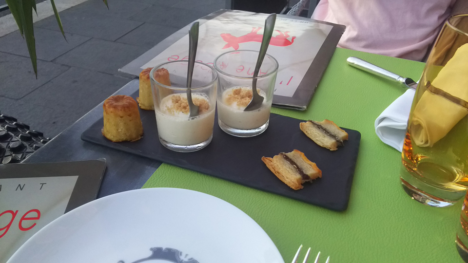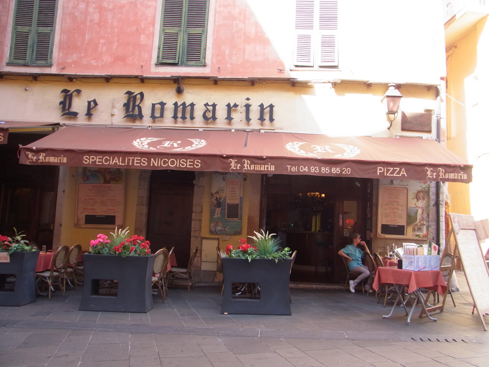 ディナーの前に夕方のニースの海岸へ行ってみた。あ、昼間プロムナード・デザングレの売店でハガキを買ったお店の写真も撮った。ここから港のすぐ横にあるラーヌ・ルージュ(赤いロバ)というお店へ。実はここのお店は20時しか予約が出来なかった。そのせいもあり、ワインも食べ物も色々売り切れてきて、好みのものを選べなかった。 |