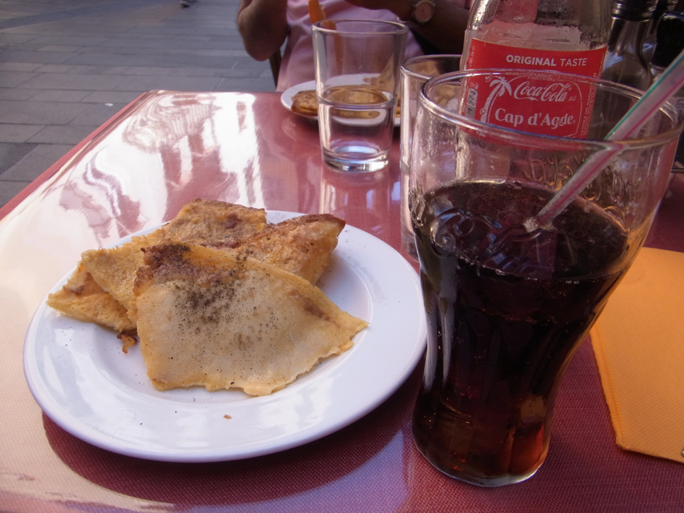 ラスカリ宮のあと、旧市街を散策しなだらソッカが食べれるお店を探していたが、意外となく、気がつけばもう16時。朝から何も食べてない。でもこのお店で聞いてみたらソッカがあったので注文!夕食前なので1つだけ注文した。ひよこ豆のペーストしたものを焼いたおやつみたいなもの。美味しいけど、飽きるのでたくさんは食べれない(笑) |