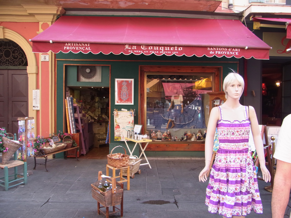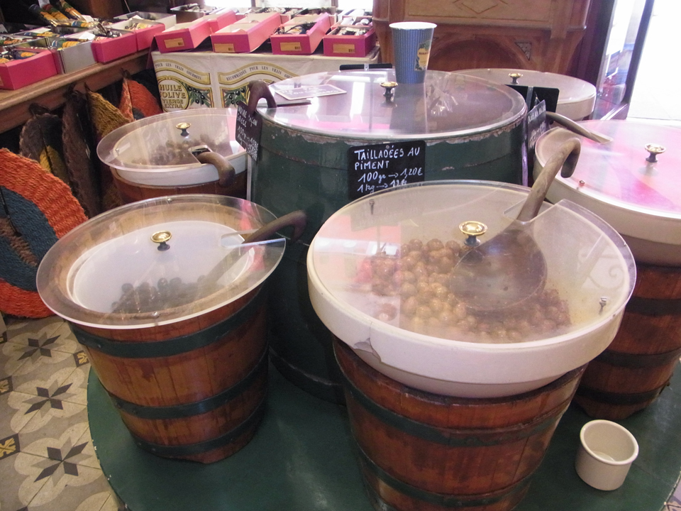 左の建物は裁判所、そして右はアルジアリというオリーブのお店。100gで1.2€とはびっくり!あと、黒オリーブのタプナードというペーストも買ってみたけど、これは今いち料理などにも上手に使えなかった。それと、この店はカードが使えない。あとはクーケットという雑貨やさんにも行った。布製品や陶器があって、やたら蝉の石鹸がたくさんあった。オエーというお菓子やさんは閉まってた。残念! |