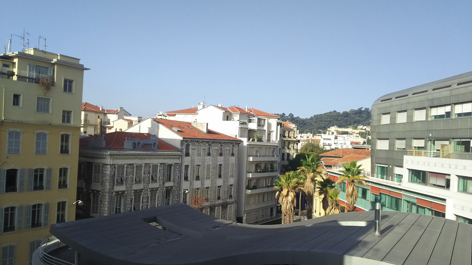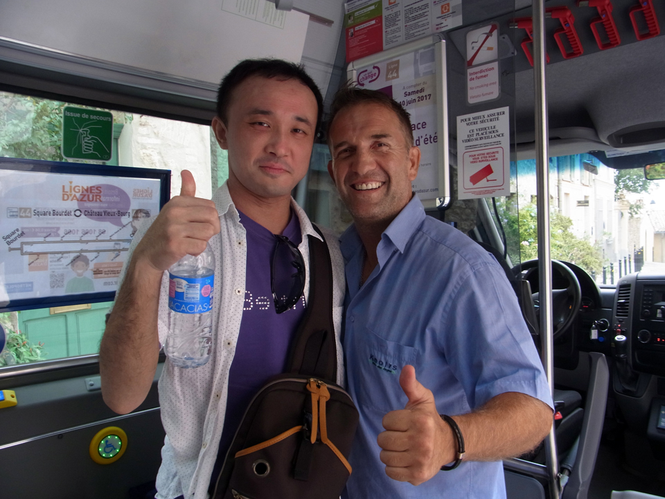 | グラース18;15発、ニース19:45着のバスに乗るけど、どう考えても乗り切れないほどの人が待っている。90分も乗るのに座れないとかあり得ないと思っていたら、何台もバスが来た。そして、ニースの海岸沿いのCongresというバス停で降りる。今日予約しているケイスケマツシマはこのバス停から一番近い。 |