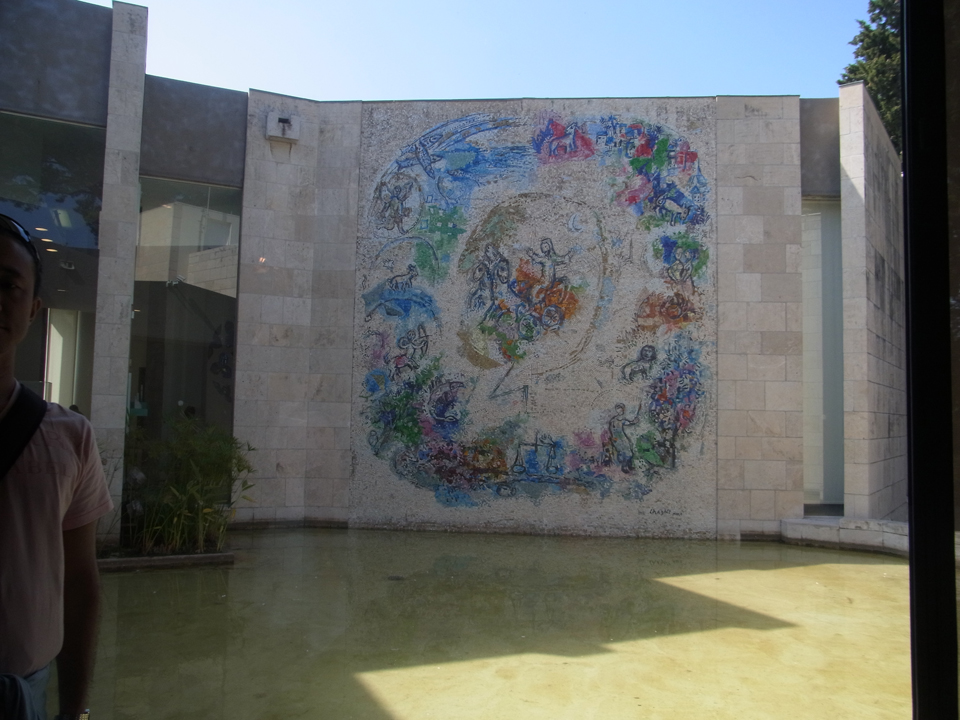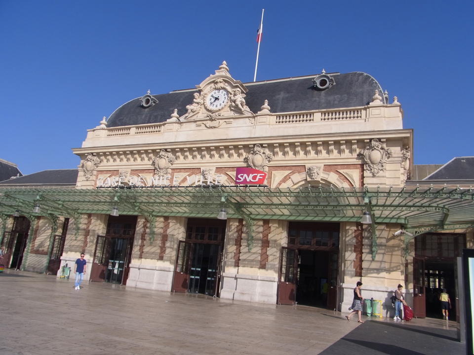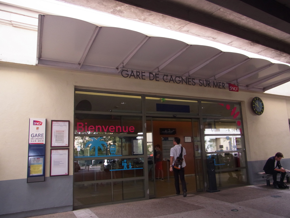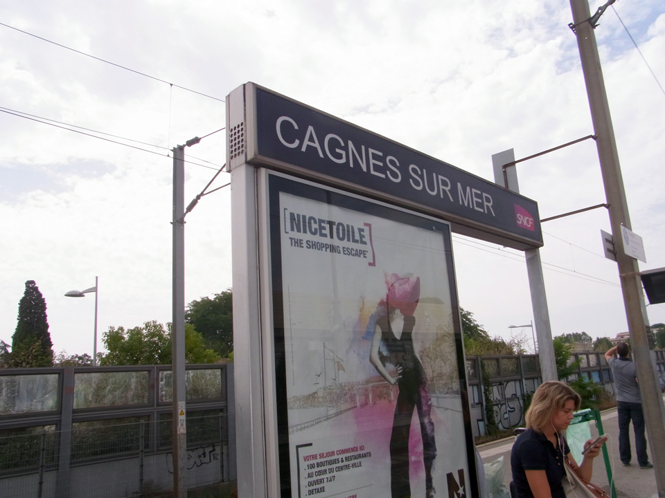 12時にカンヌ行きの電車に乗らないといけないので、今からカーニュ・シュル・メールの駅までテクテク歩く。途中、ドラゴンボールの絵などが壁に描かれたアニメのお店?を発見!そして、駅にはこんなモザイクタイルの絵がありました。(下)電車は時間通り。途中アンティーブに停車したのでパチリ。ここも行きたかったな。 |