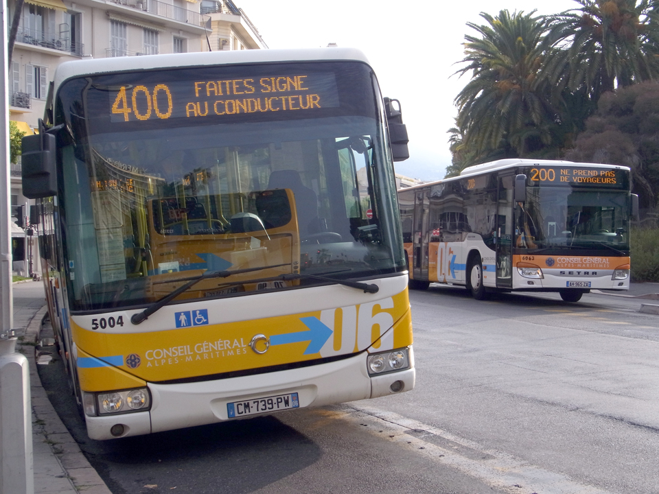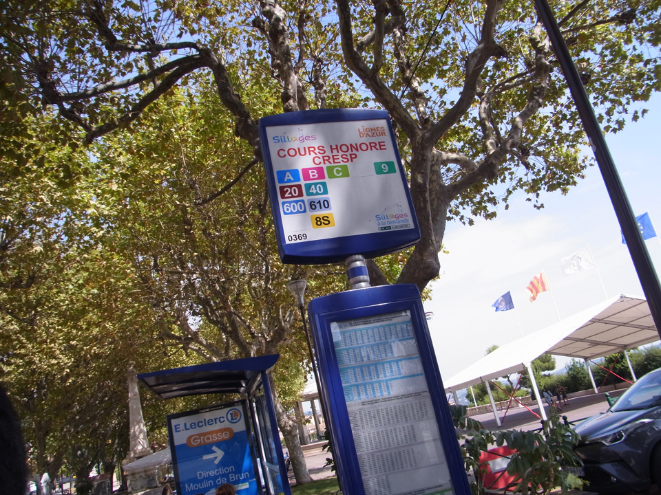 今日は3つの町をバスや電車で移動するので大変です。ホテルでまず朝食を食べて、Albert 1er Verdunのバス停へはトラムで行ったかなあ。このverdun通りは、バス停がいくつかある。8時35分に400番のバスに乗ってカーニュ・シュル・メールへ。ちなみに長距離バスの詳細は旅のミニ情報を。そして、この44番のバスがナヴェット。 |