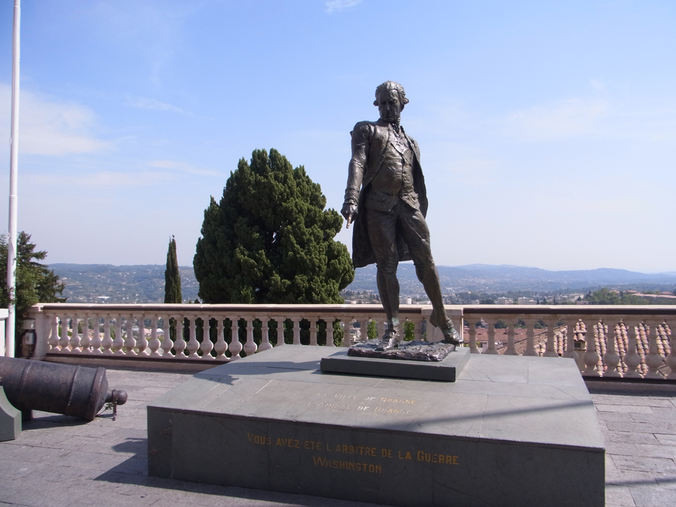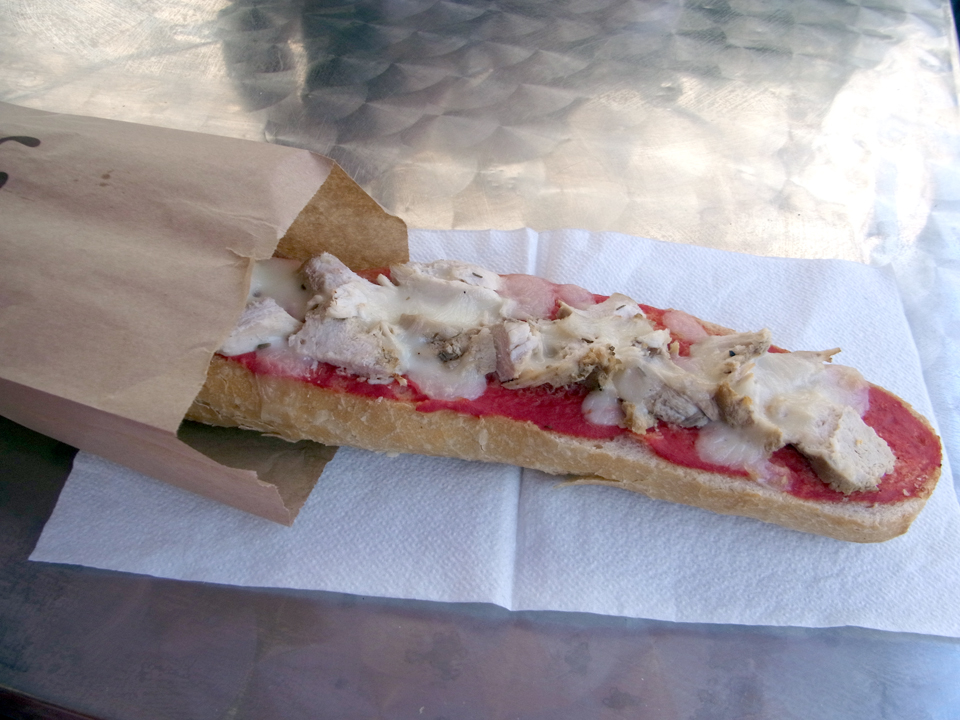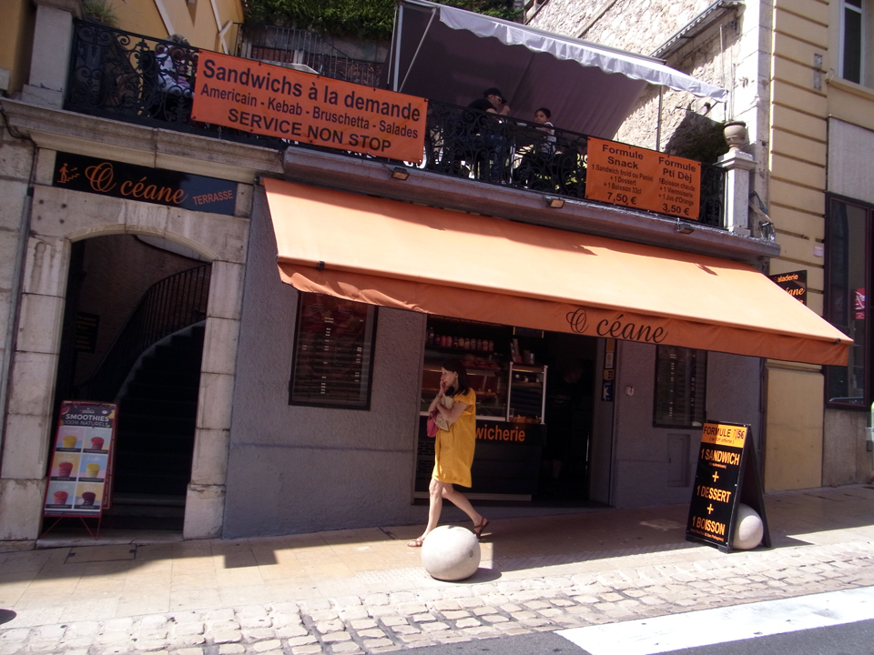 ナポレオンがプロヴァンス・アルプ地方を大移動した時に通った道路で、グラースで一休みしたそう。お腹が空いたので、国際香水美術館の前のサンドイッチやさんで軽く食べる。メニューが読みづらく、種類がいまいちよくわからないが、適当に買って二階へ持っていって食べる。向いが国際美術館なので二階からよく見える。 |