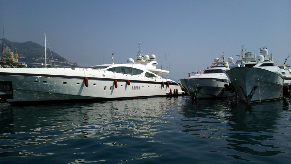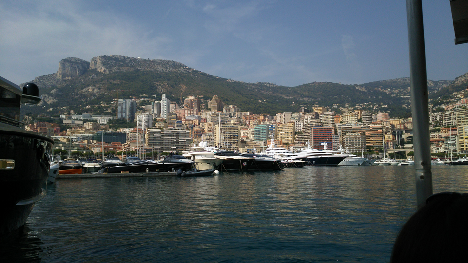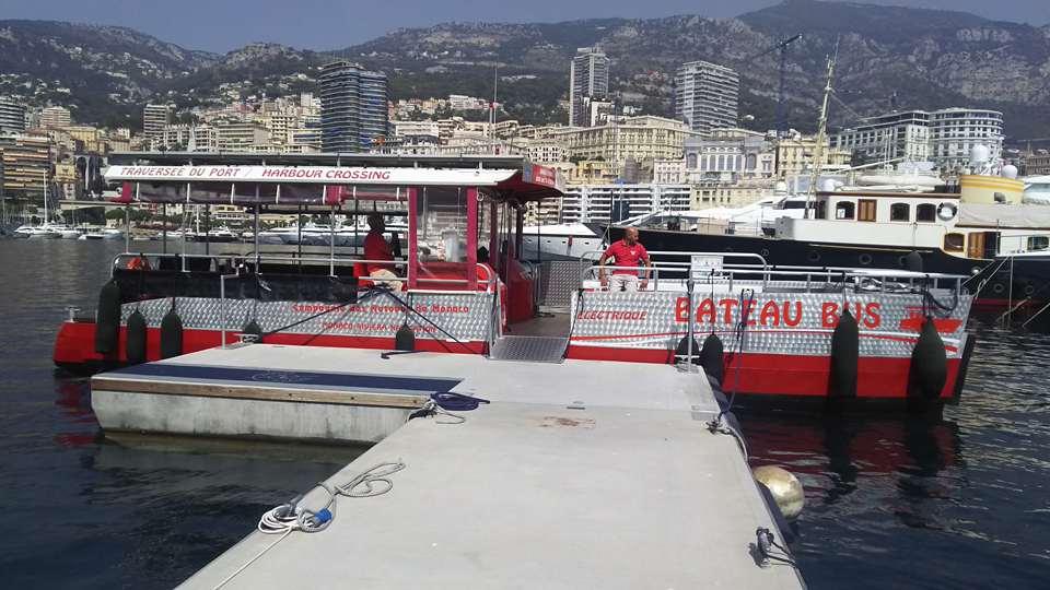 次は反対側に渡るためだけに乗ったバトビュス。ほんの10分くらいだけど、船の中からモナコらしい背景の写真が撮れます。あまり乗る人がいないのか貸切状態(笑)船の中にいたスタッフの人に写真を頼むと、「外に出た方がいい写真が撮れるよ」と撮ってくれたのが右の写真。この写真は年賀状にも使いました。 |